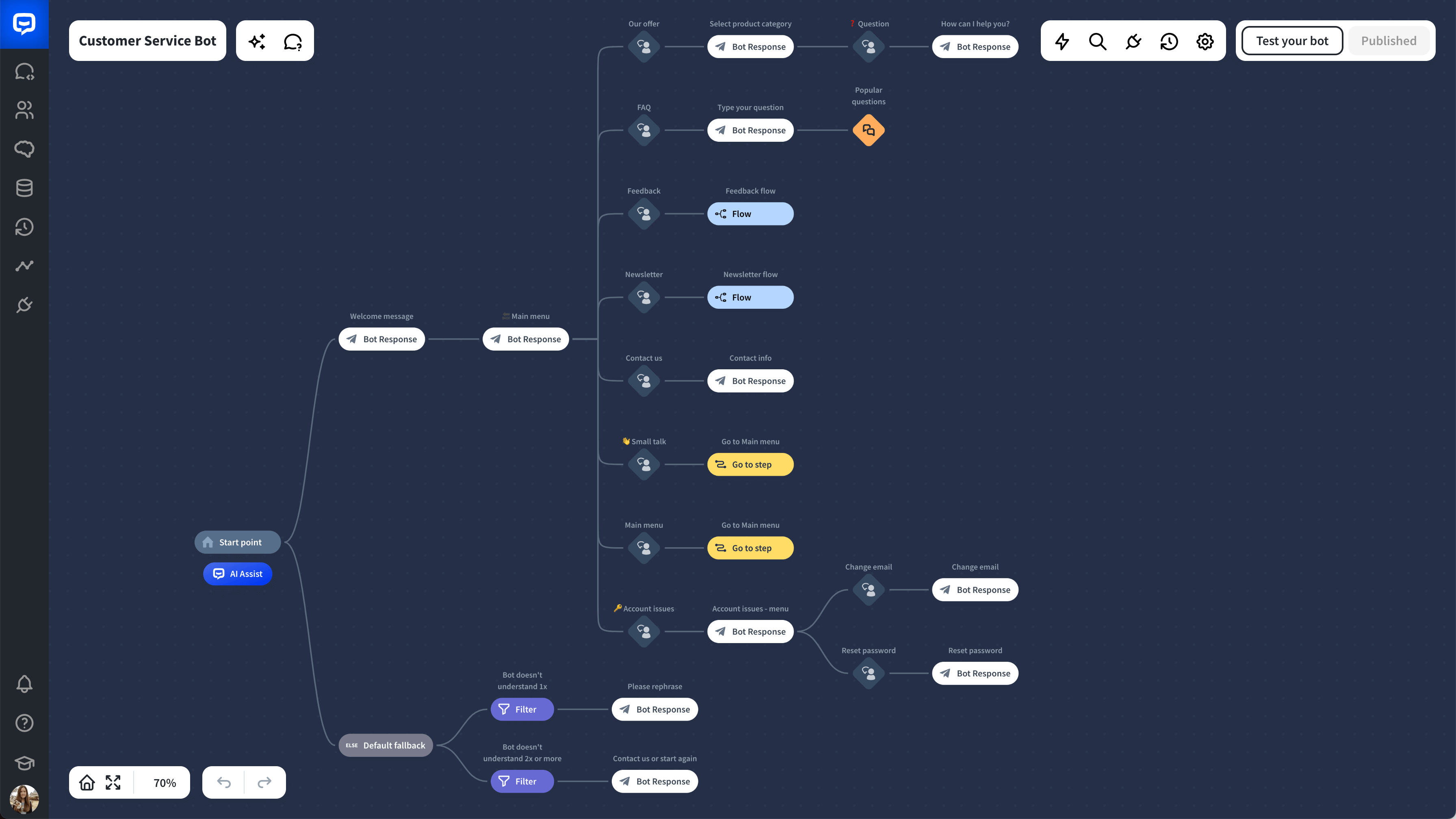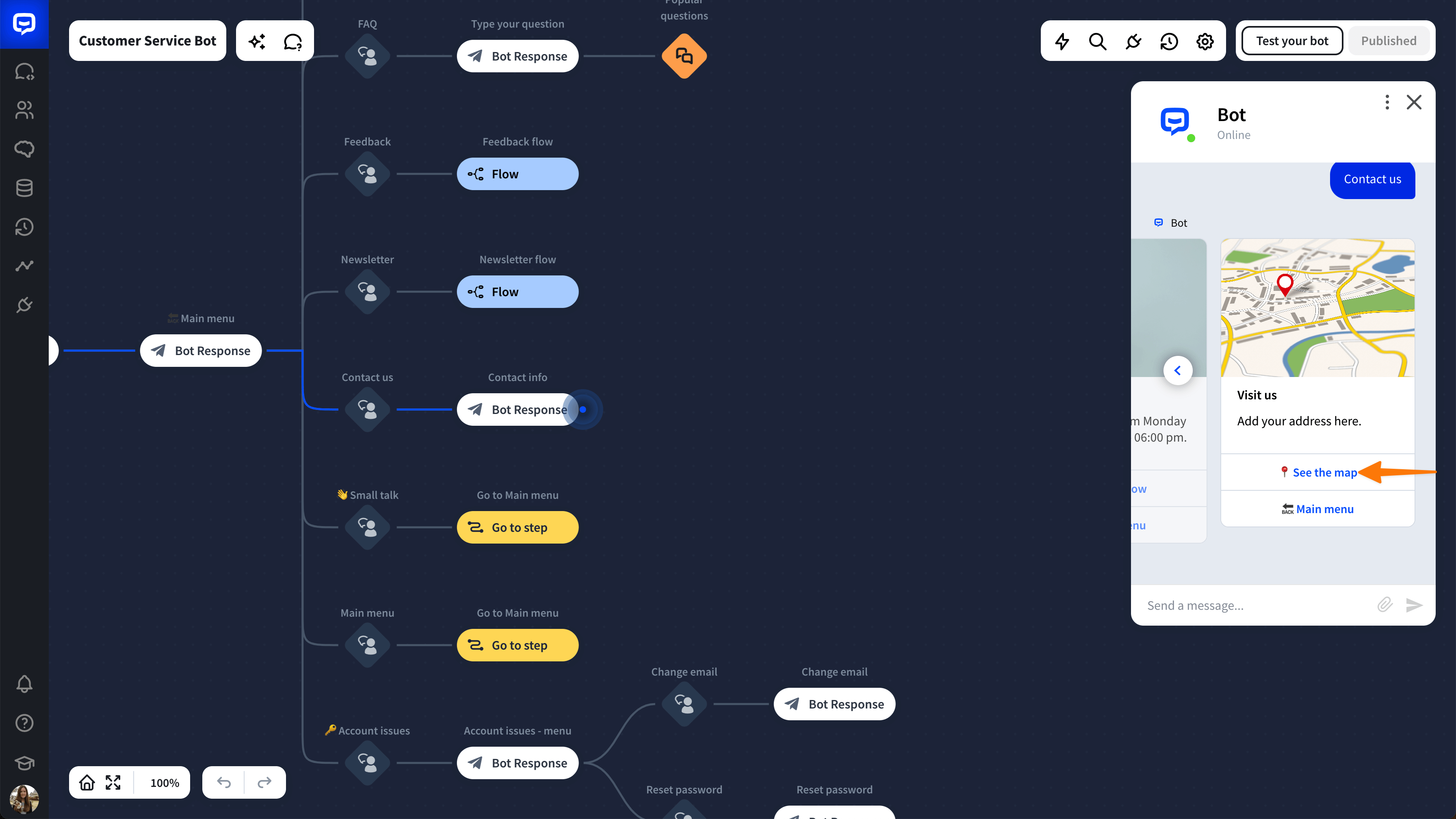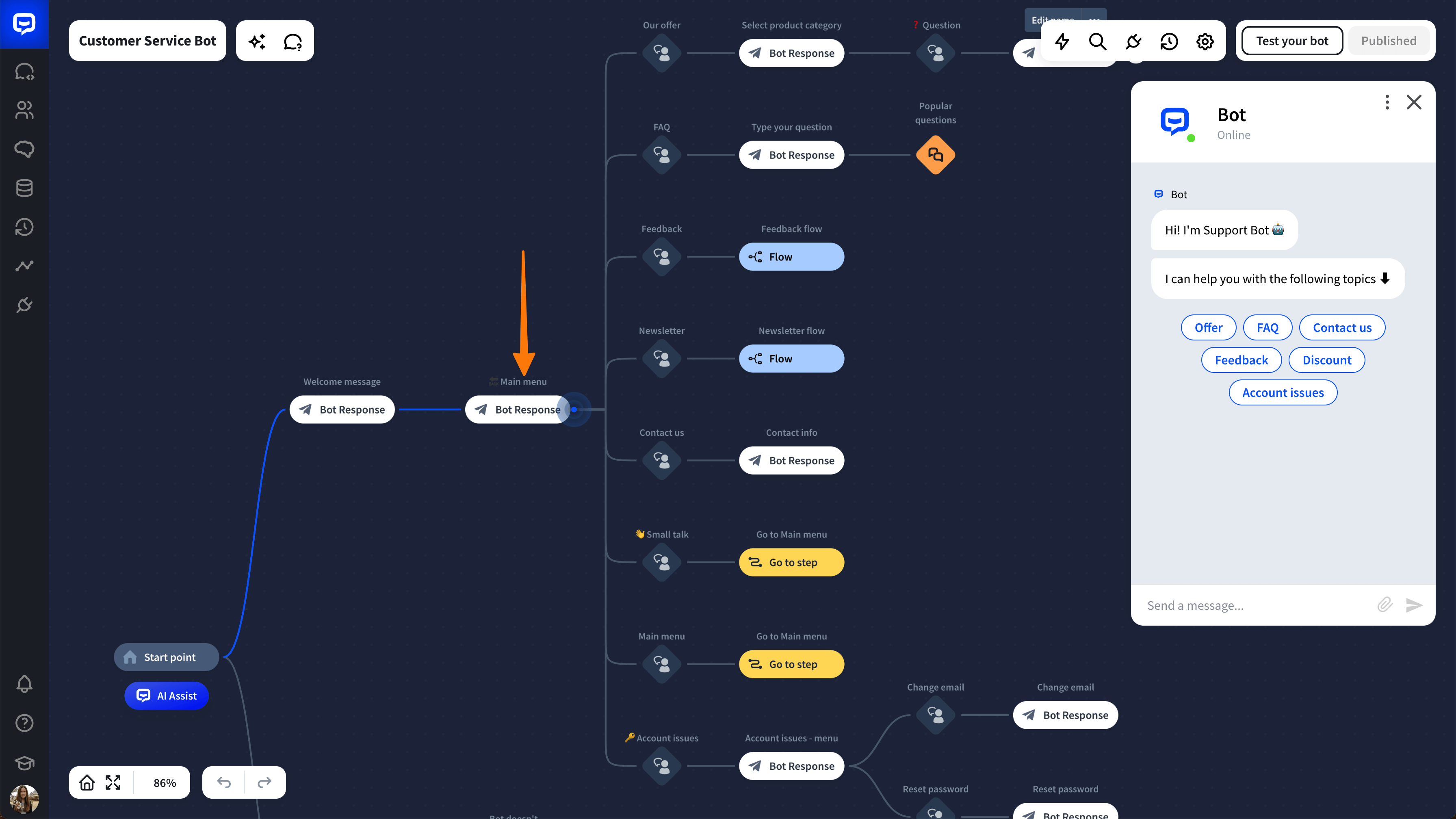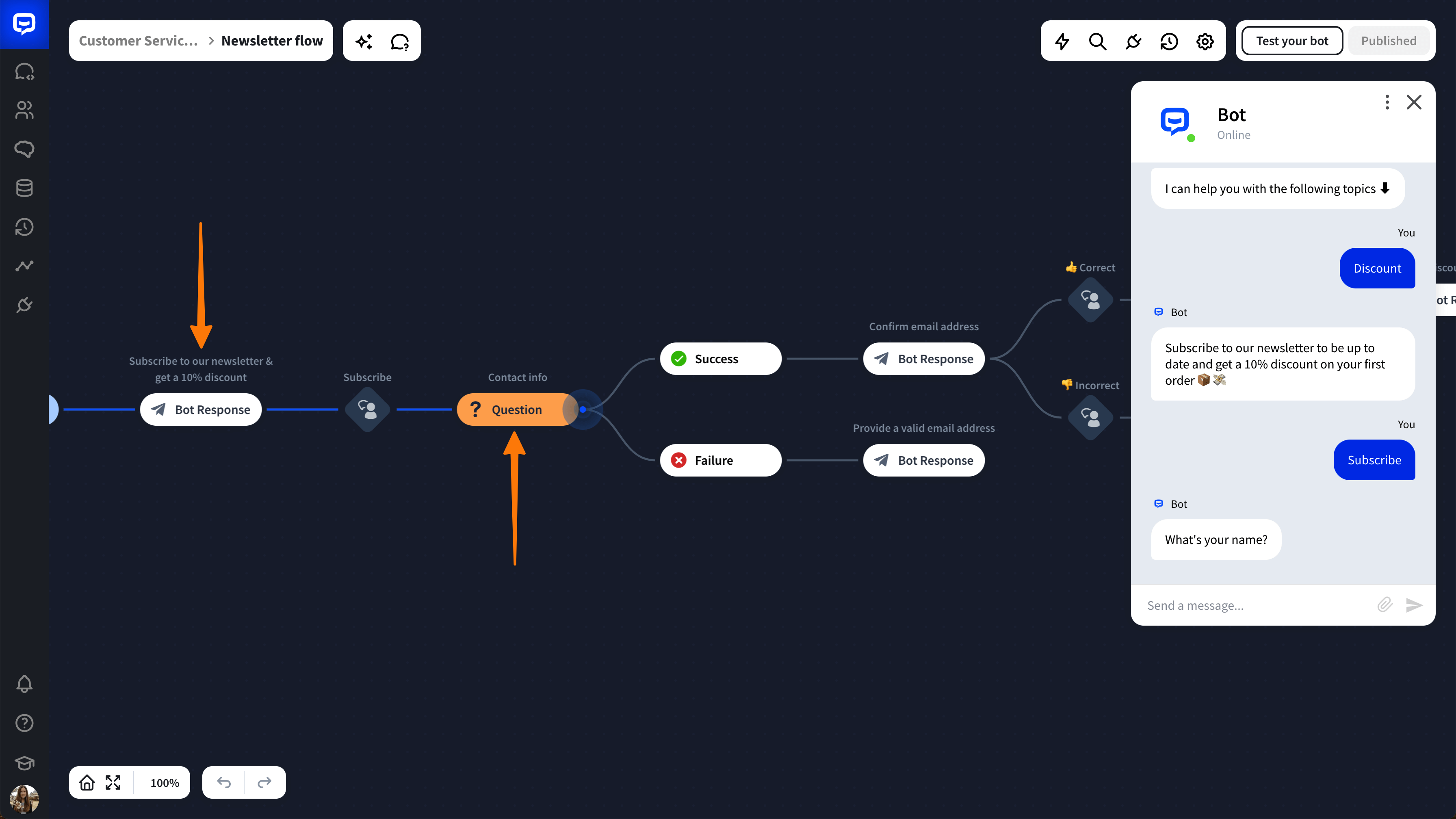 Help customers navigate the most important sections of your website, promote your products, and collect feedback. You can also use the template to share discounts or coupon codes with users who sign up for your newsletter via your chatbot.