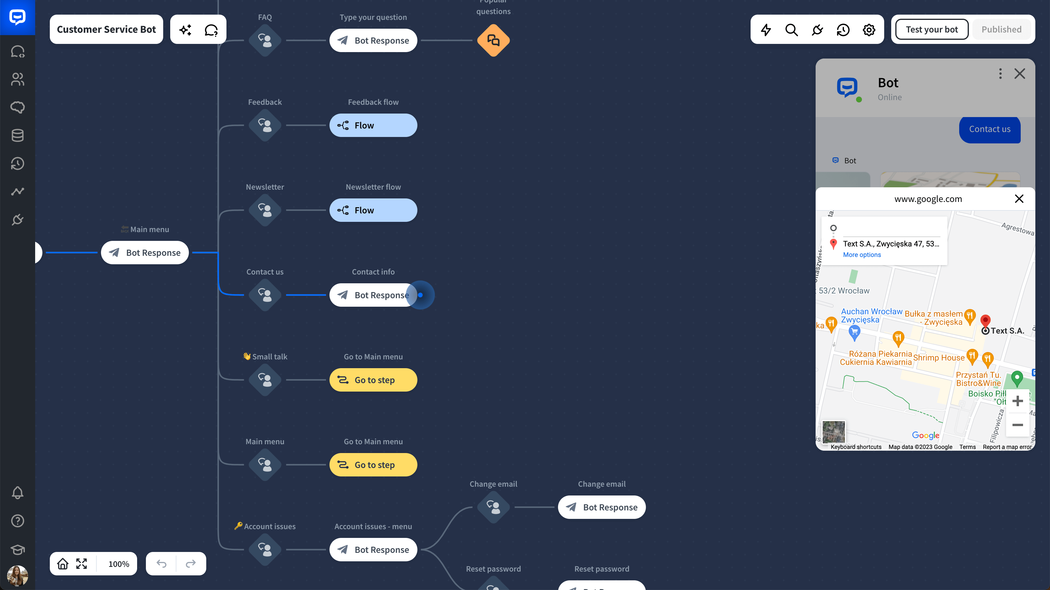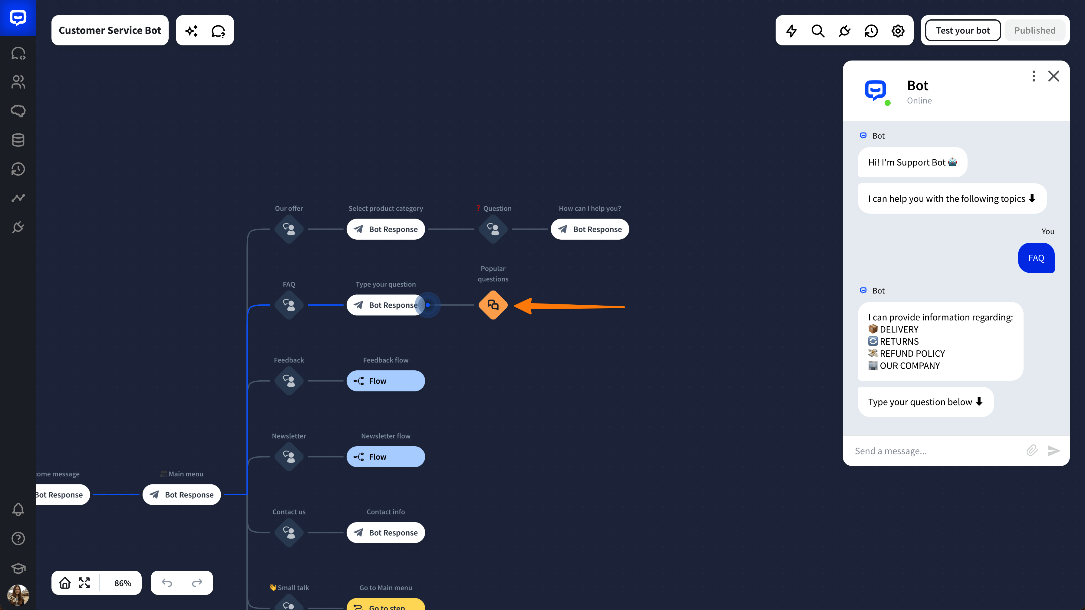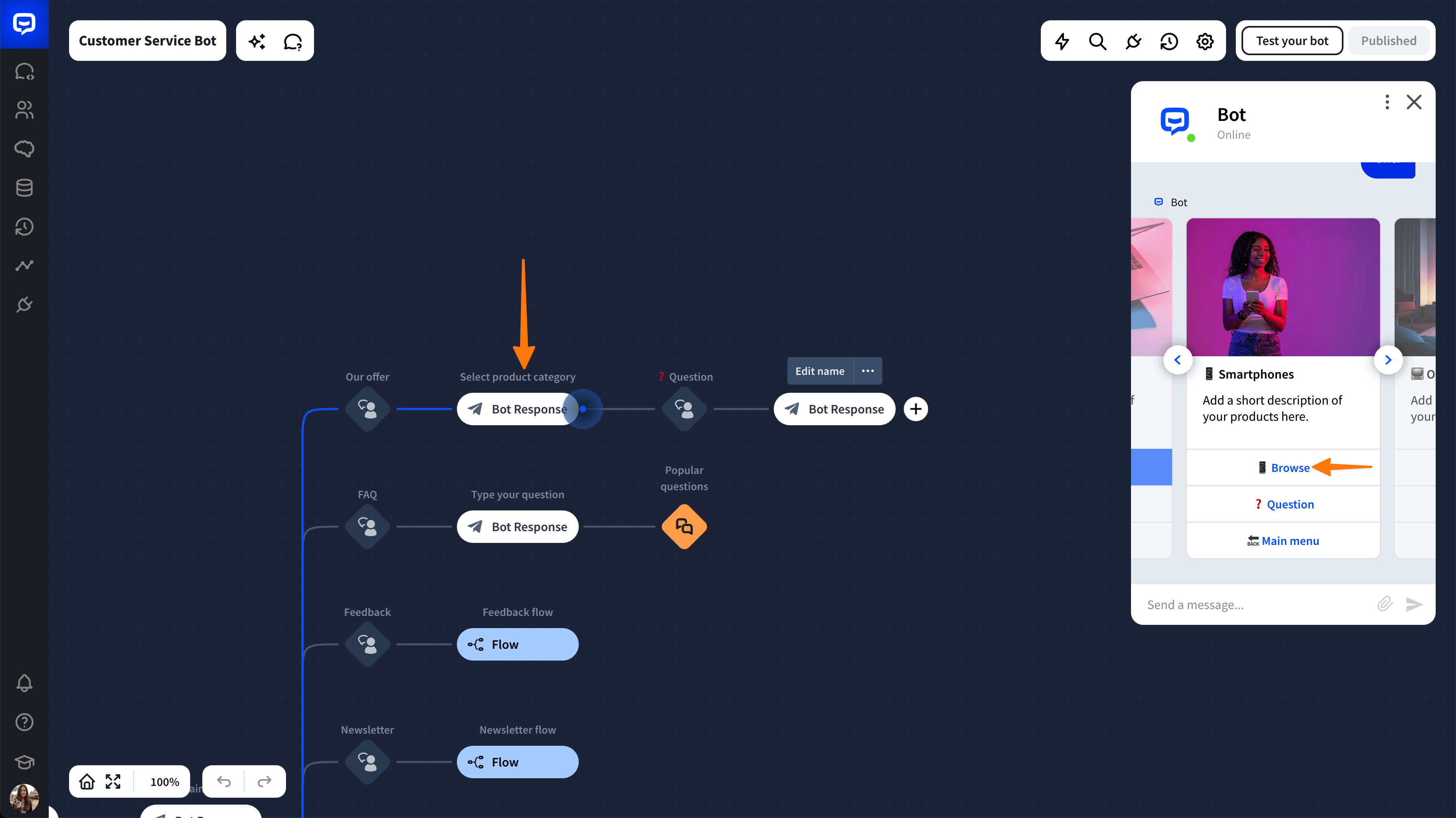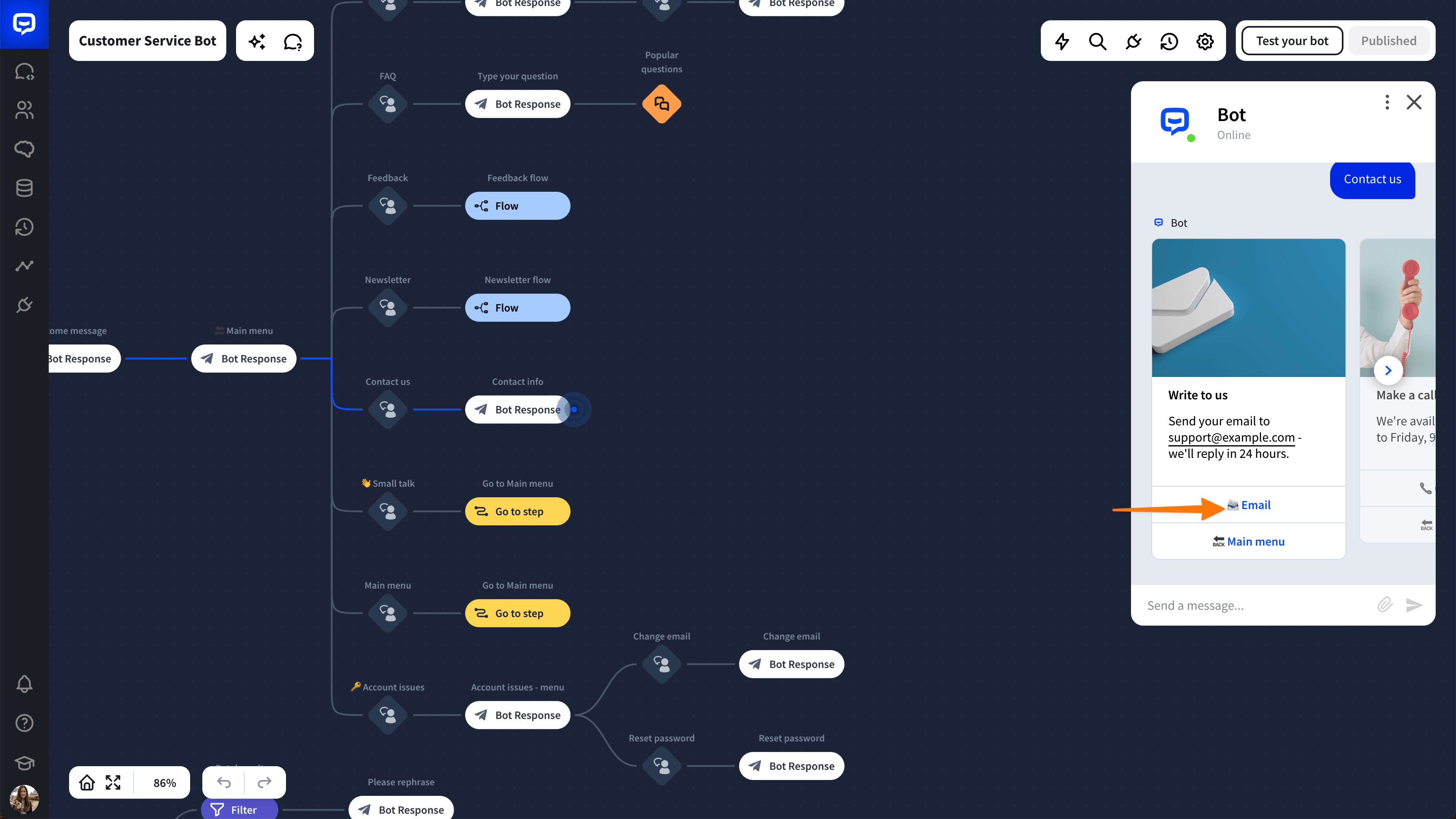 Help customers navigate the most important sections of your website, promote your products, and collect feedback. You can also use the template to share discounts or coupon codes with users who sign up for your newsletter via your chatbot.
