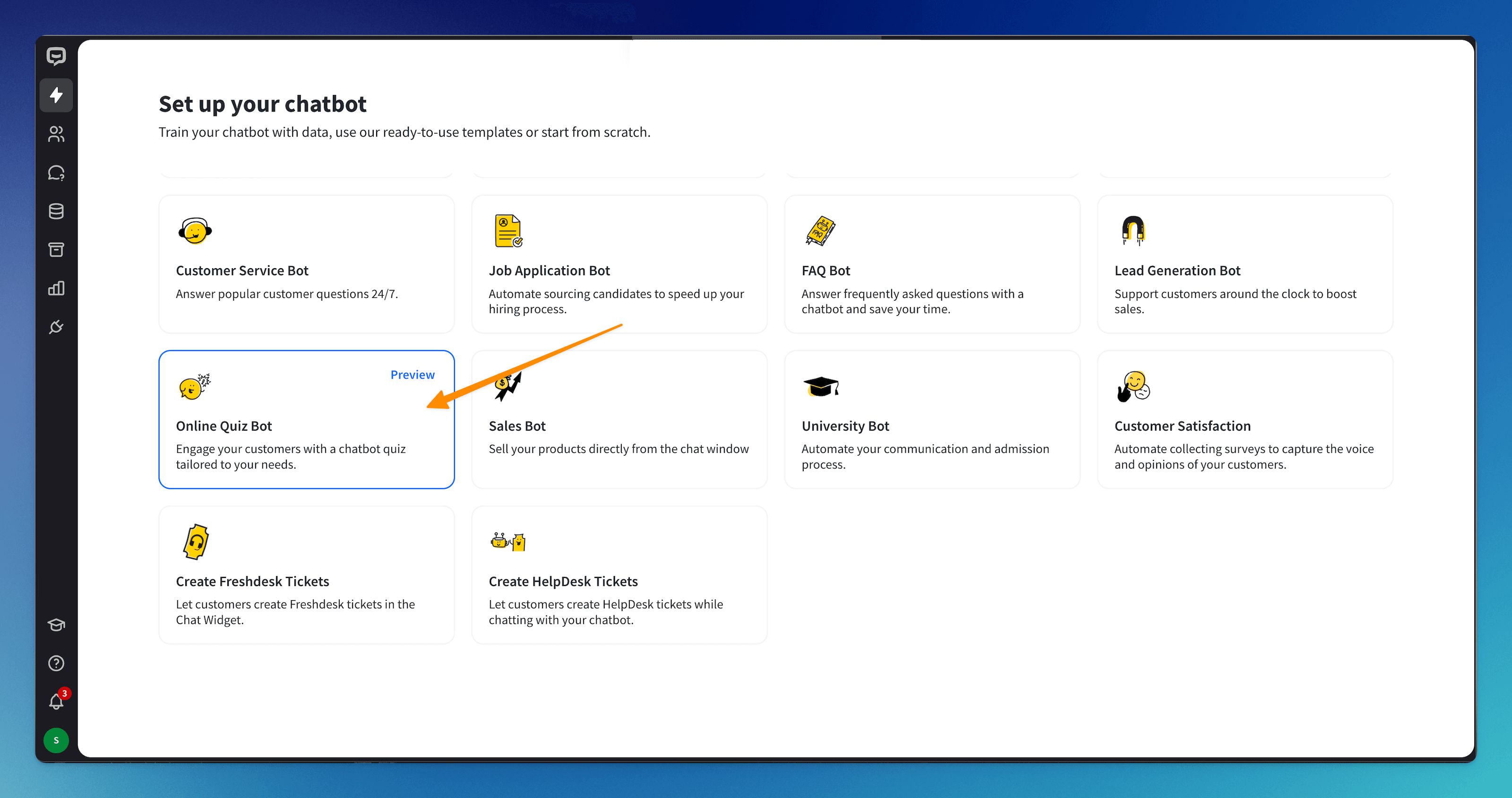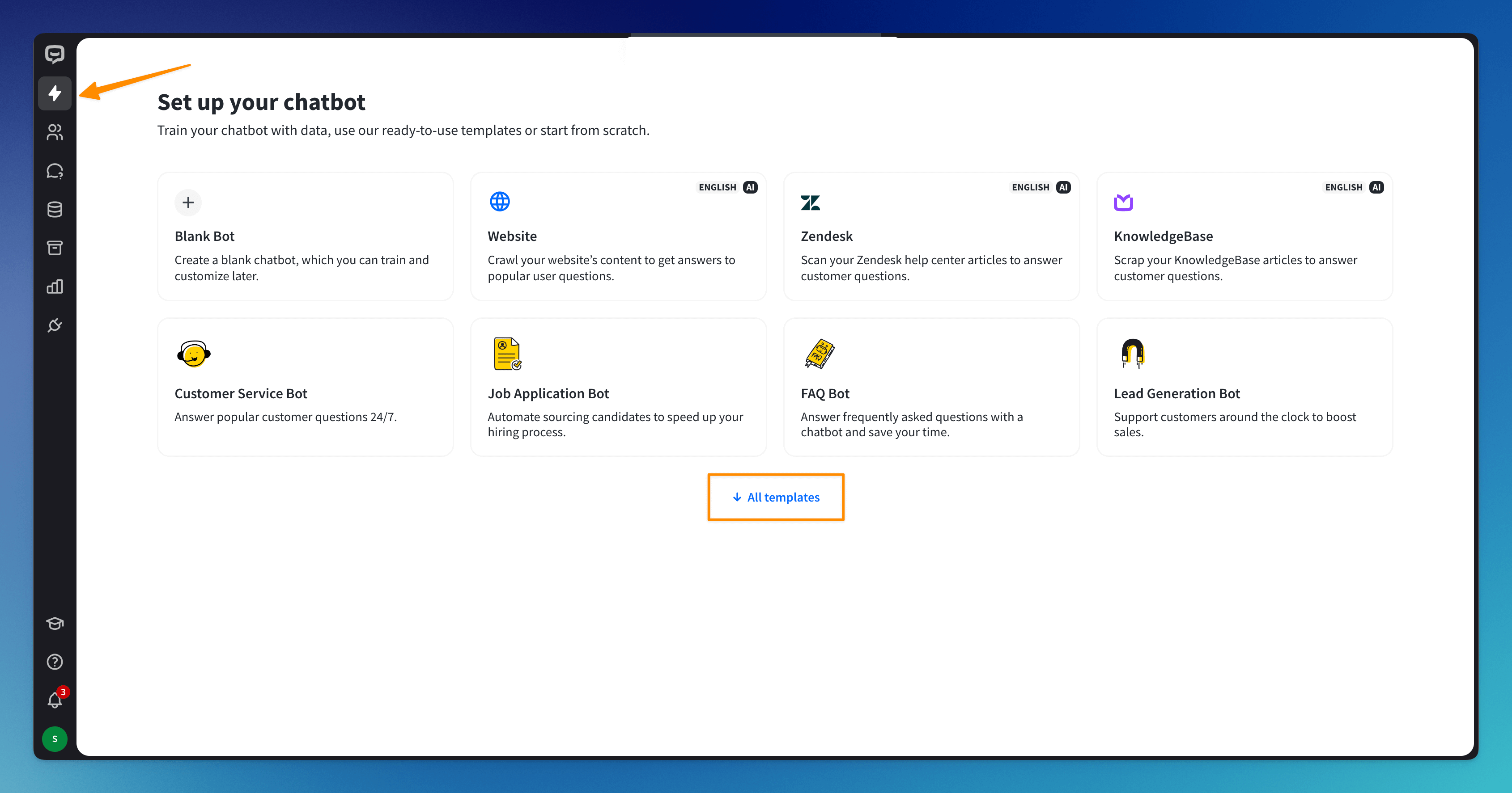 Templates are customizable bot flows that let you launch task-specific chatbots with just a few clicks. Within minutes, you can breathe life into your chatbots.