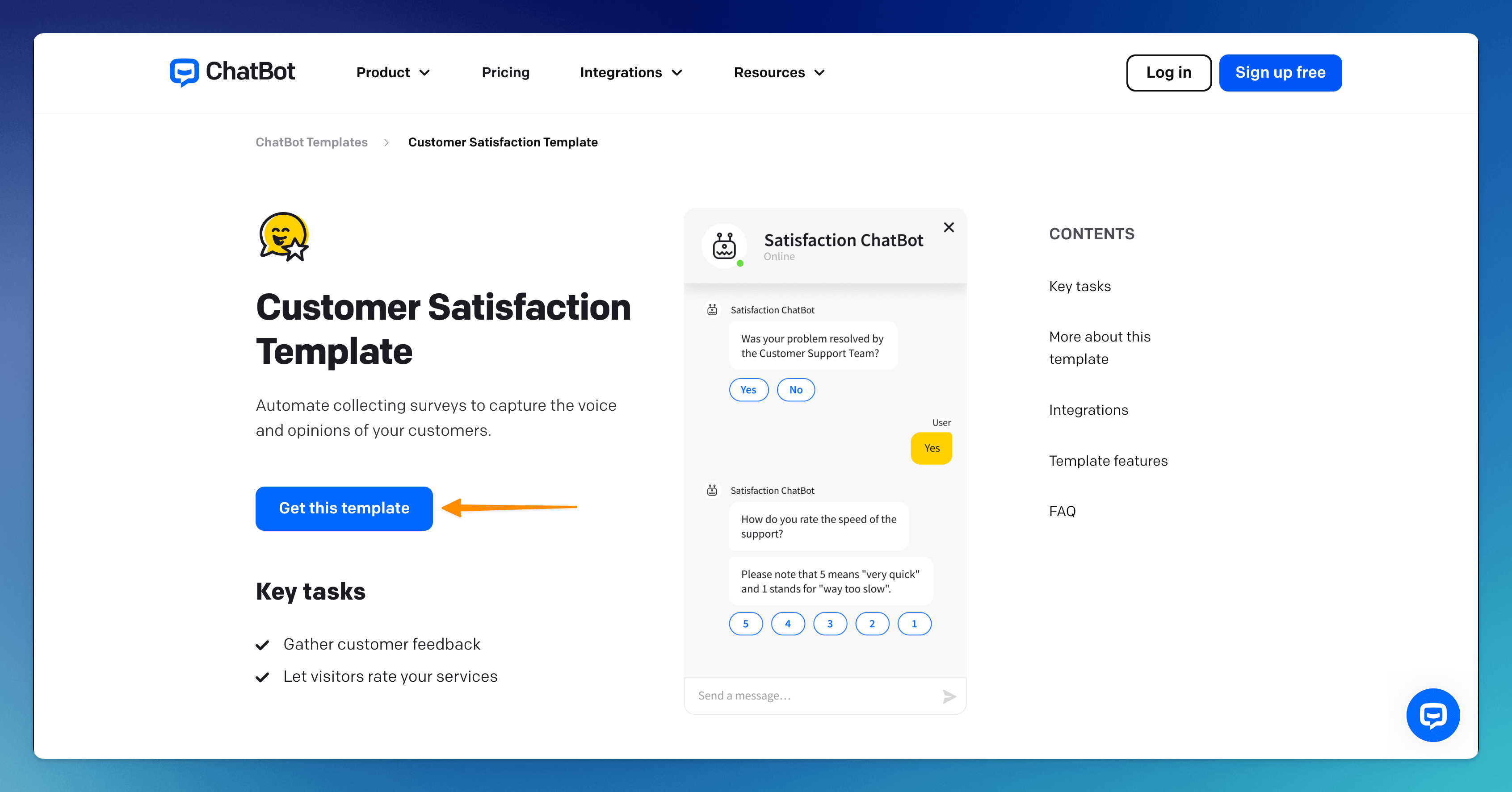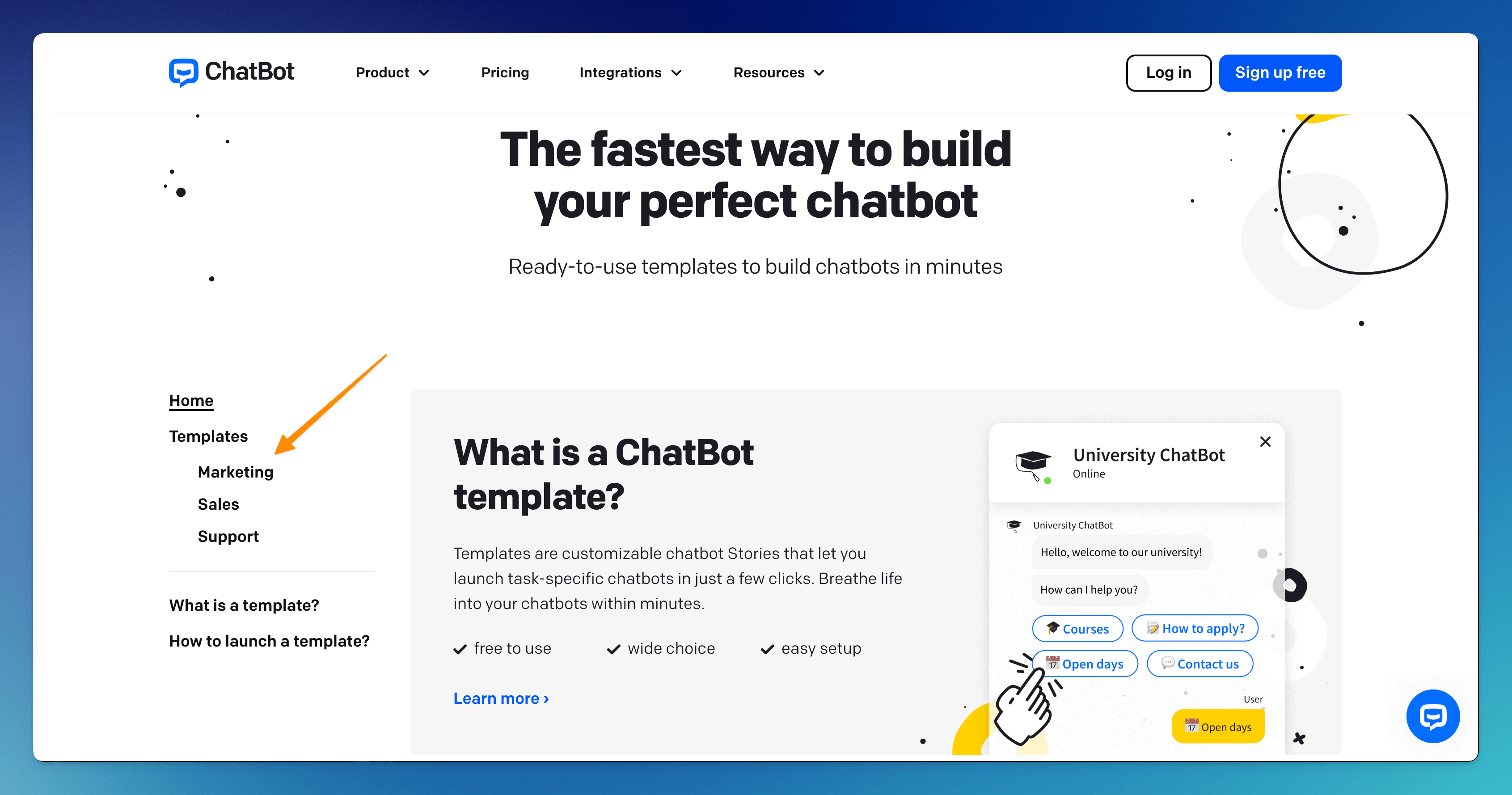 ChatBot templates cover the most popular marketing, sales, and support cases. Our marketplace has a complete list of ChatBot templates, and you can learn about their key tasks.