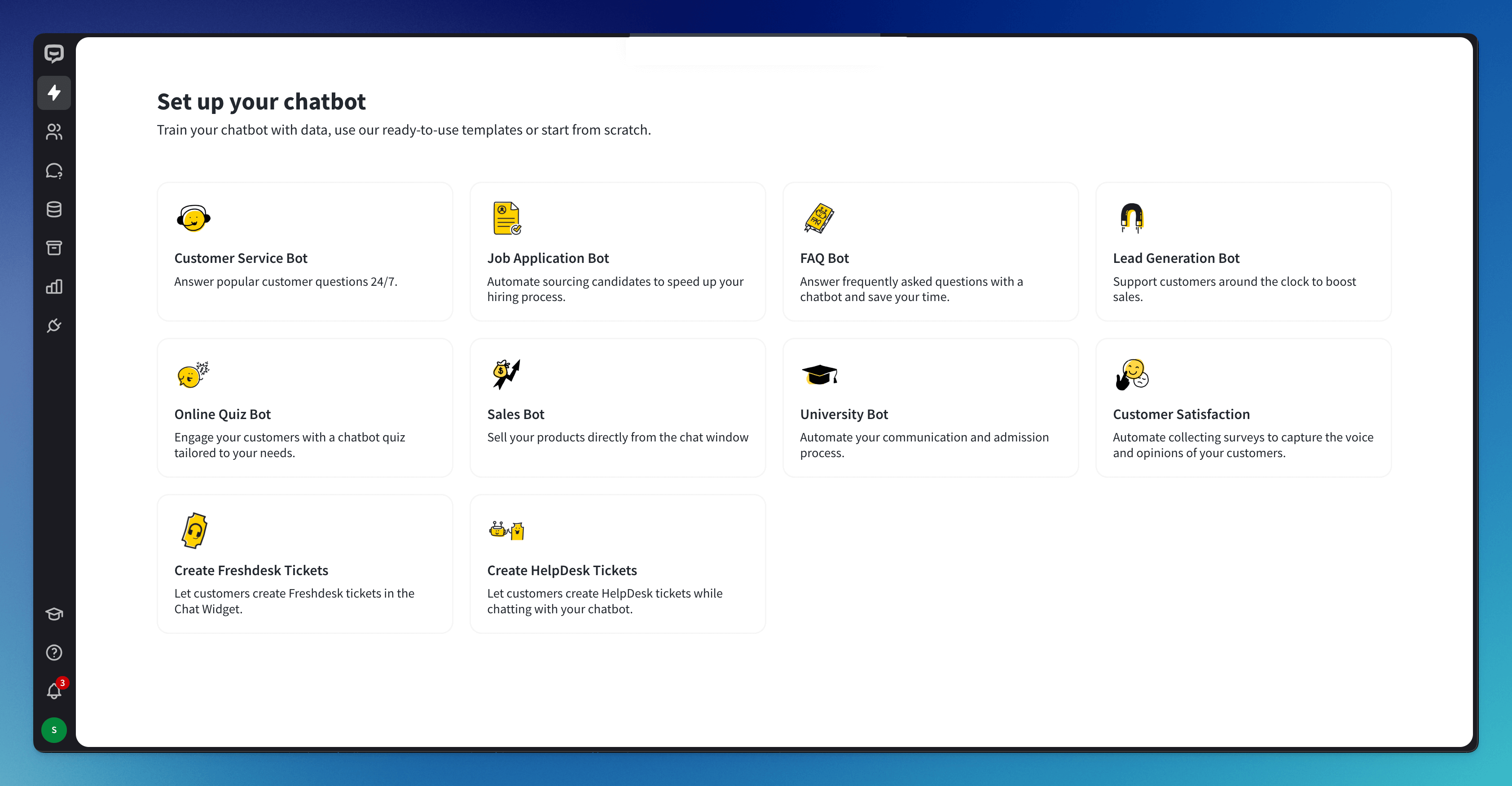 Templates are pre-designed chatbots for specific tasks accessible from the ChatBot Dashboard. You can build your ideal chatbot using a customizable bot template.