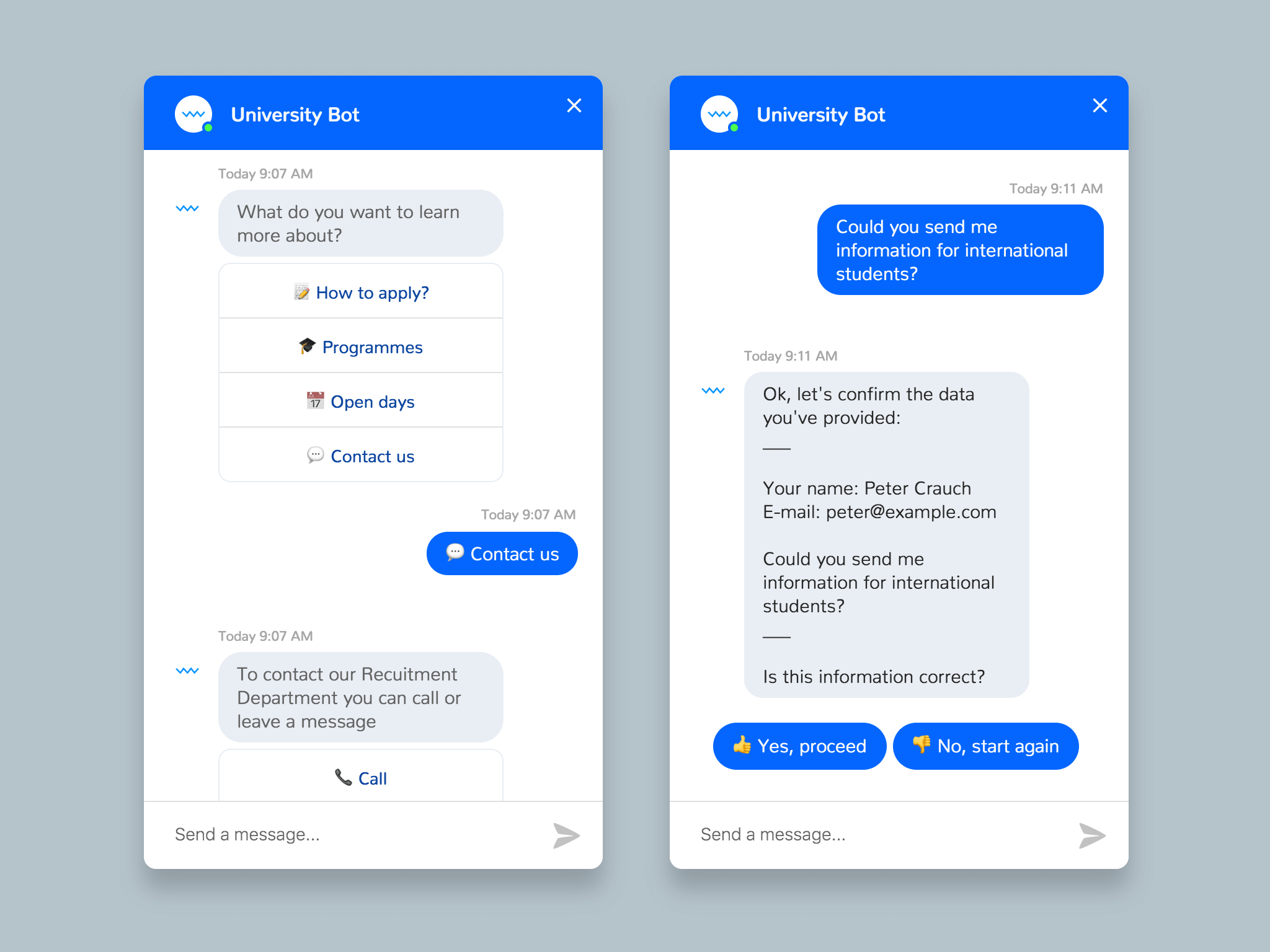 Engage more candidates on your website and Facebook page using conversational marketing. Enable easy navigation through the most important sections on your website with a virtual assistant and never miss a chance to interact with your potential students.