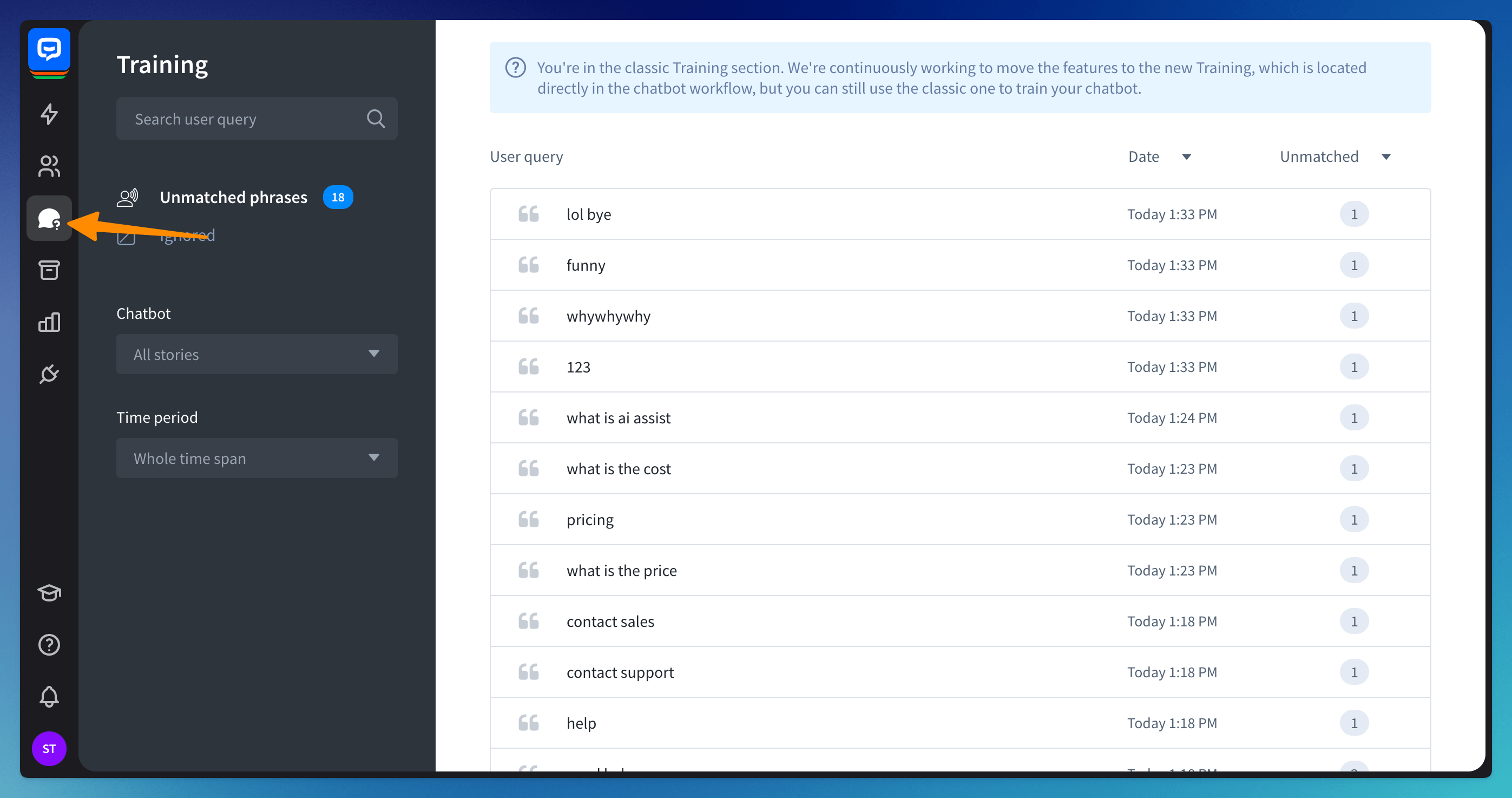 Log in to your ChatBot account to see your dashboard. To enter the training, select the option from the left sidebar.
