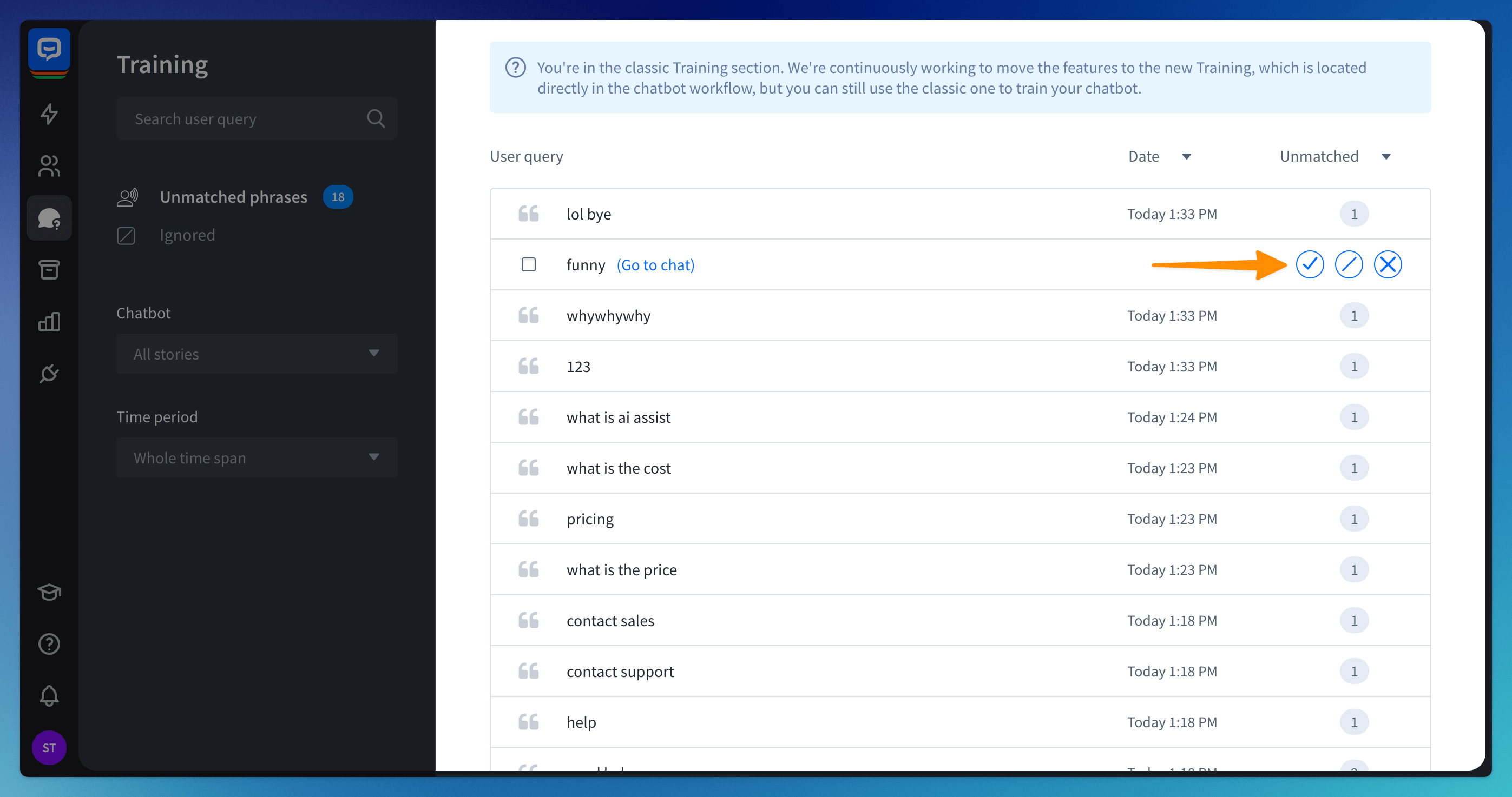 Delete – Remove phrases temporarily from the training. If a phrase occurs again, it’ll appear as an unmatched query.