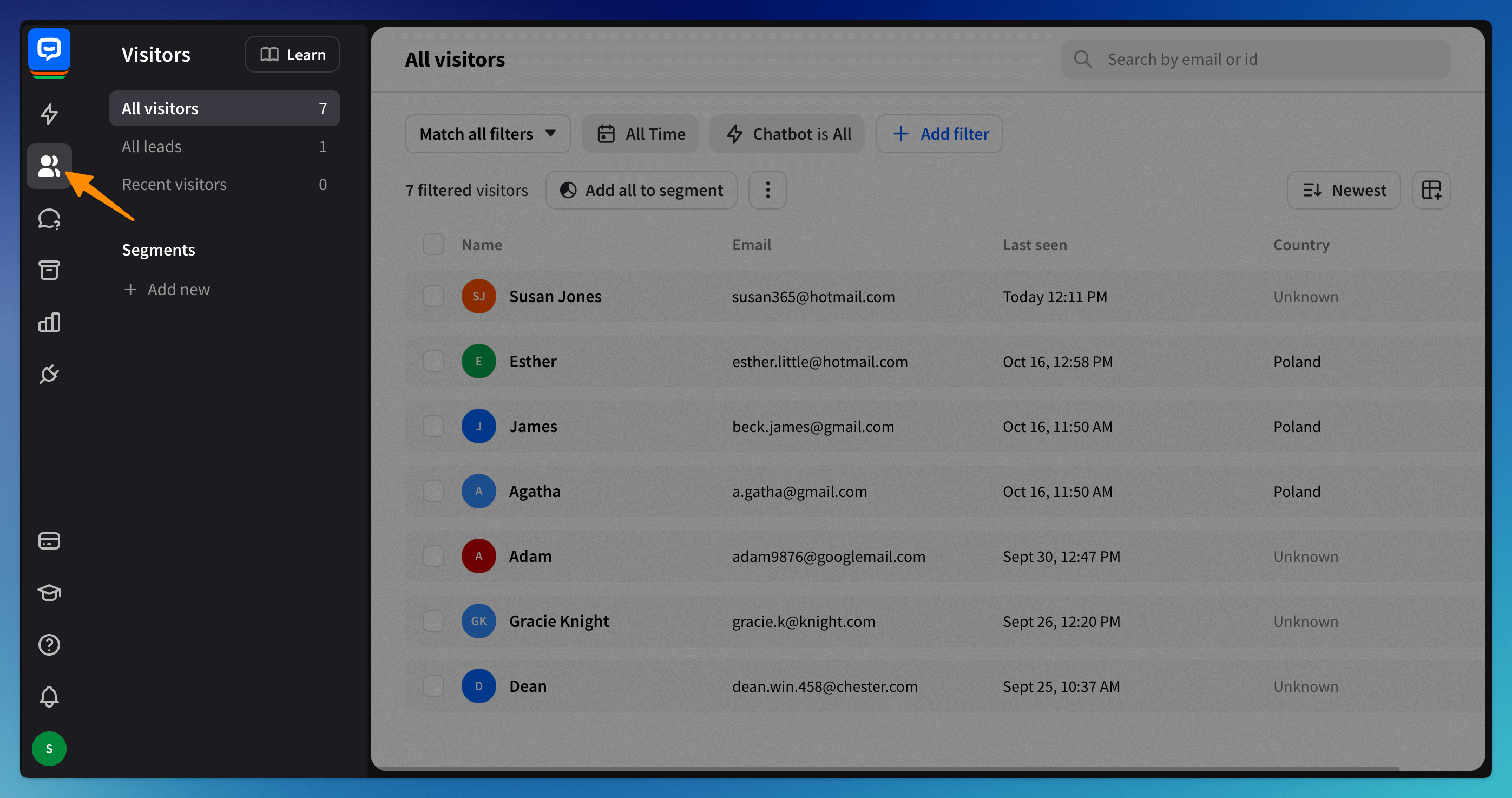 You can perform the same actions as in the All visitors section — add visitors to segments, filter them as needed, export the information, and delete visitors under the 3-dot symbol.