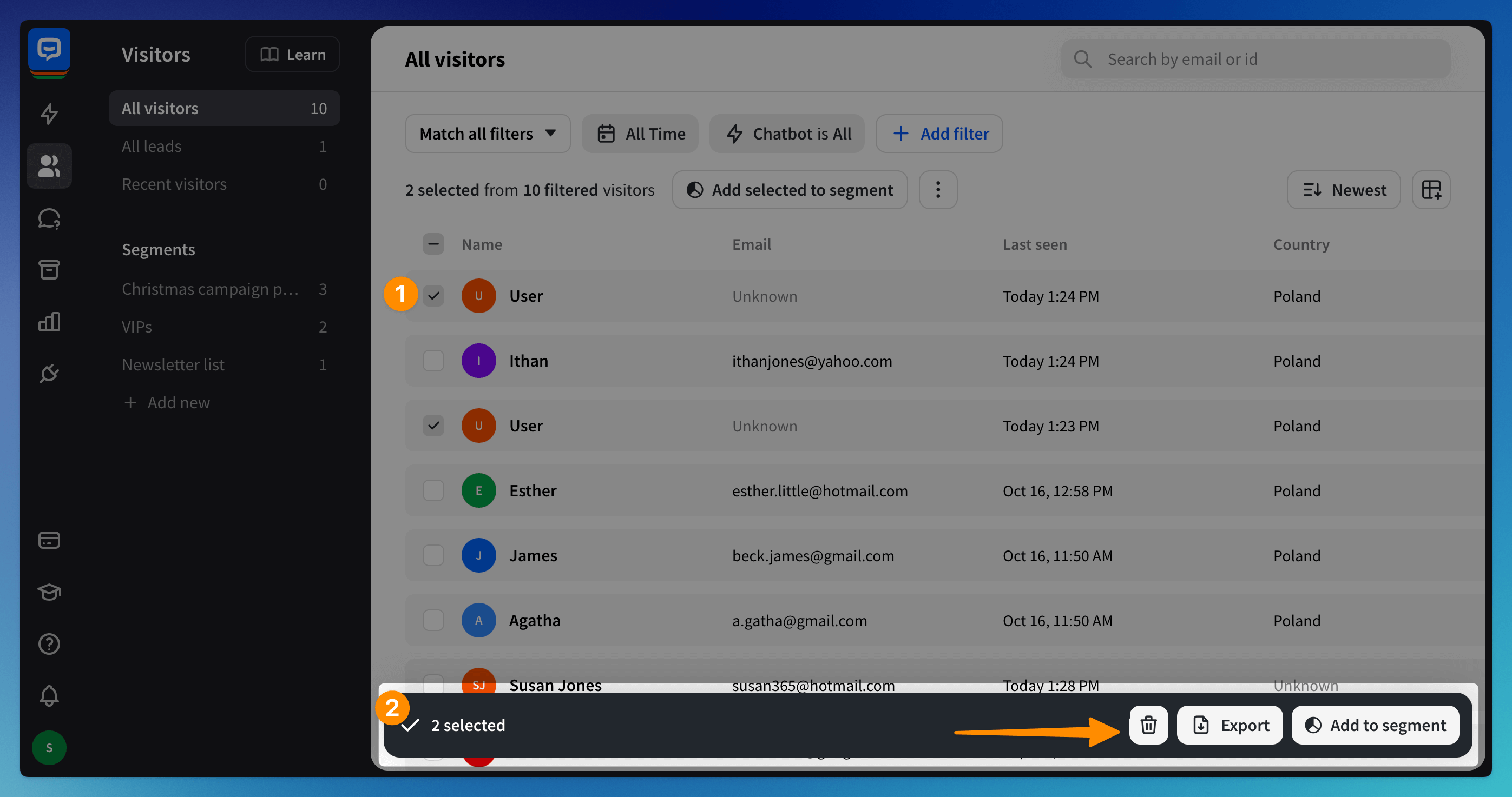You can select multiple visitors from the list and perform one of the available actions in bulk — export all the visitor data to a single .csv file, add visitors to Segments, or delete them.