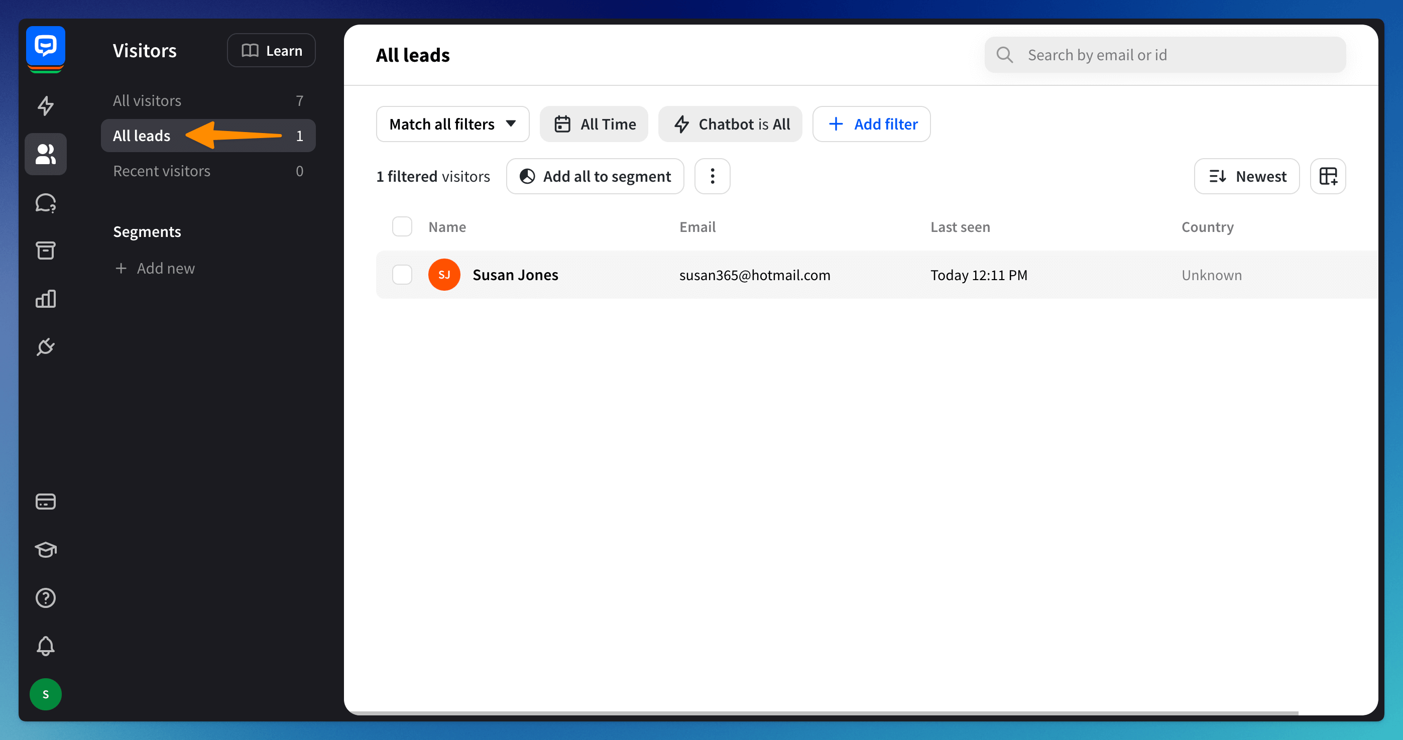 This section shows all the leads your bot has gathered during chats. The Add to leads action in the bot flow lets you decide which visitors will be here. You can gather sales leads, marketing leads, or support leads here.
