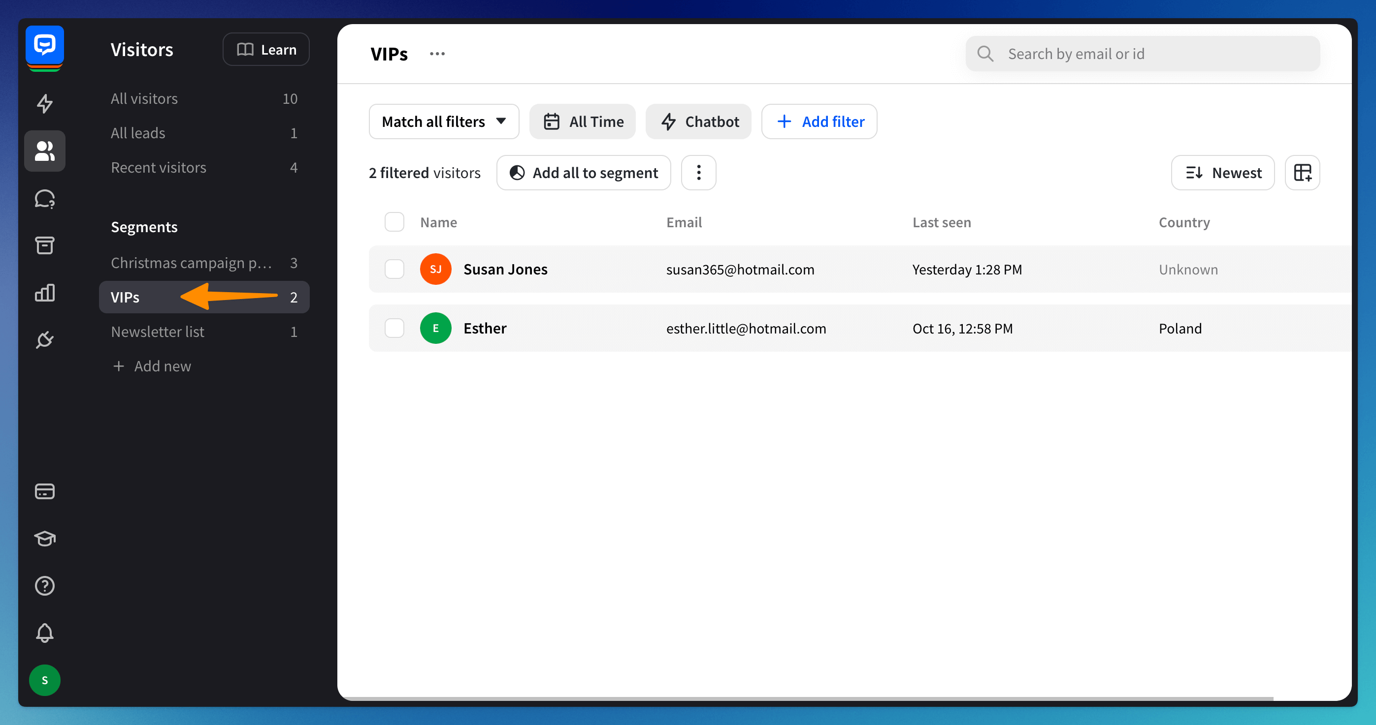 You can create a segment to collect people who want to join your newsletter, VIP visitors, returning visitors, and more. Depending on your needs, you can add or delete visitors from Segments at any point in this section.