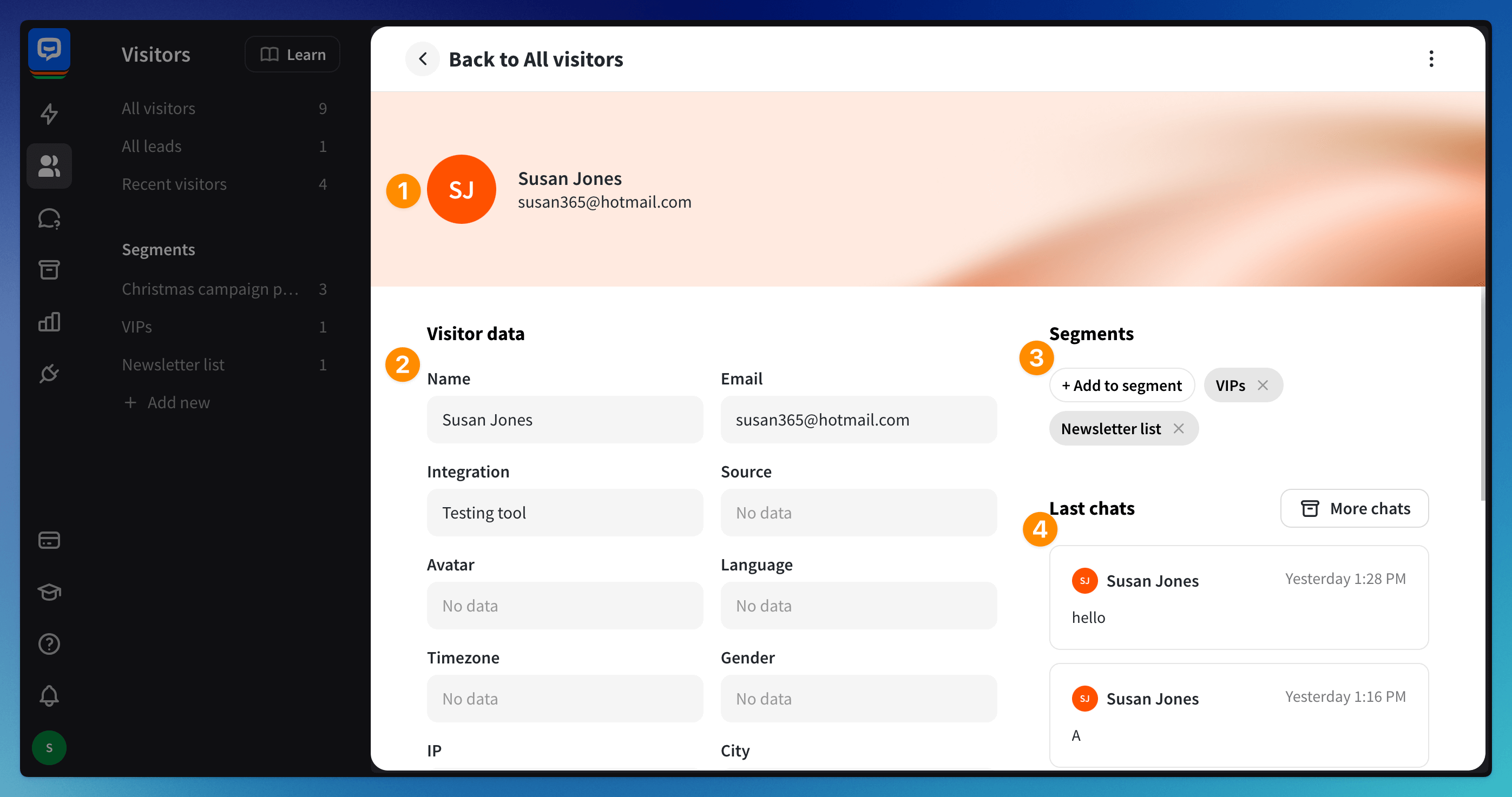 Below, you can find Visitor data (2) — the basic details collected by the bot at the beginning of the chat. Additionally, you can view the Segments (3) the visitor is a part of and the previous chats (4) the visitor had with the bot.