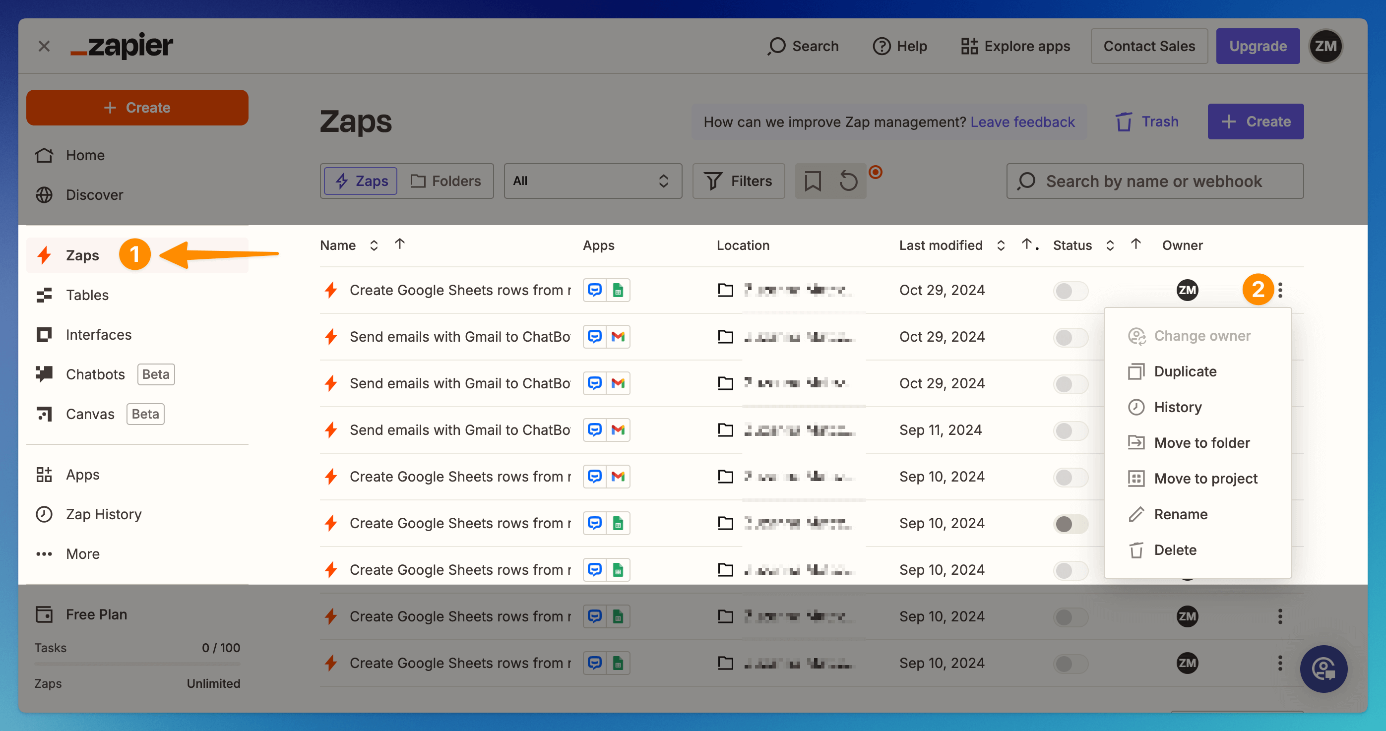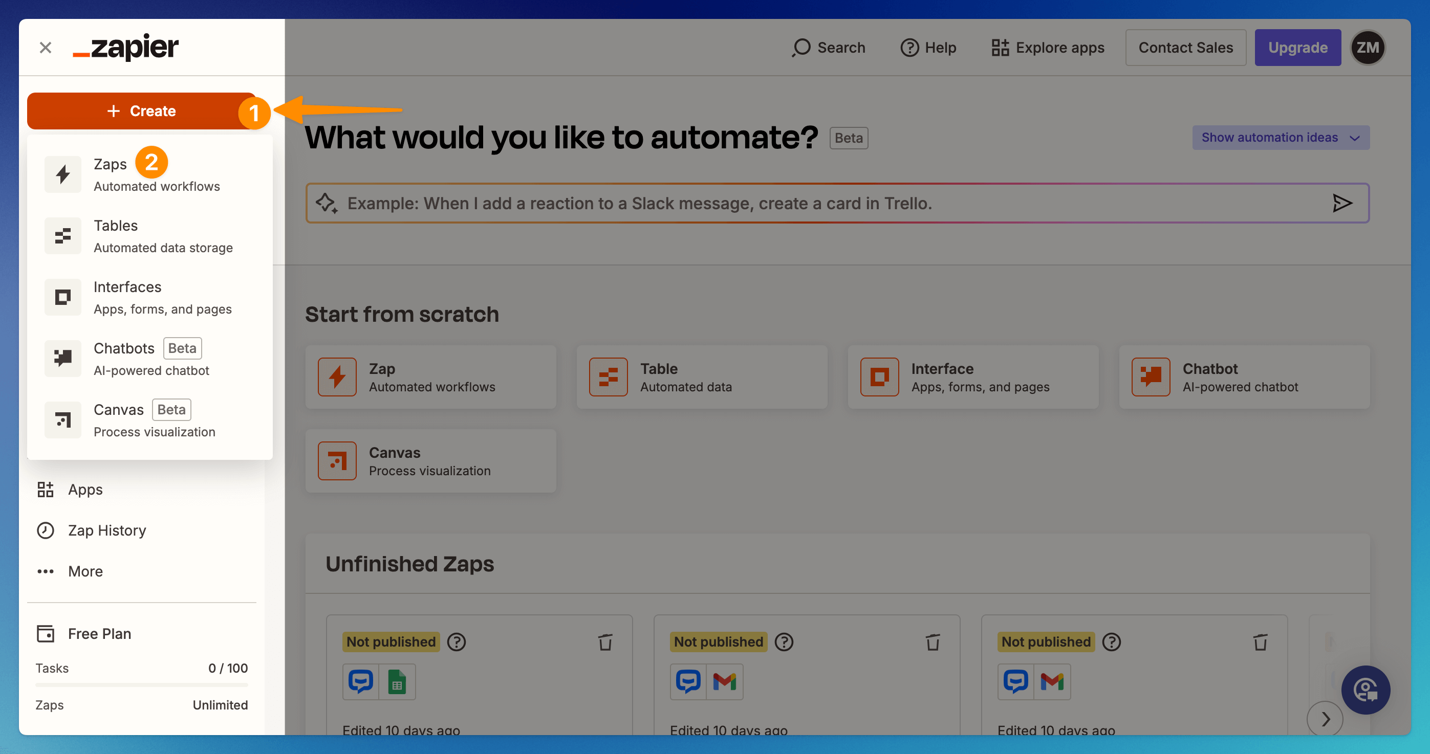 Go to zapier.com and choose the Create button on your account. Choose Zaps from the list.