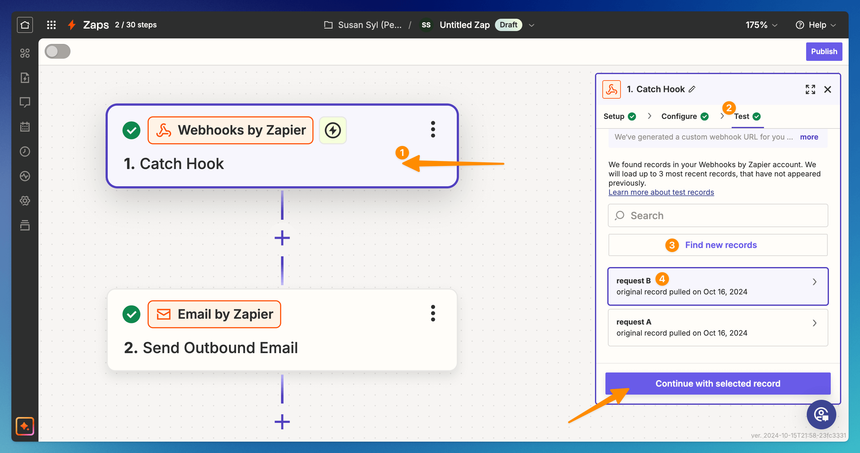 Go back to the Zapier site. Go to the (1) Trigger module, (2) choose the Test stage, and (3) Find new records button. (4) Choose request B from the list. Click the Continue with selected records button.