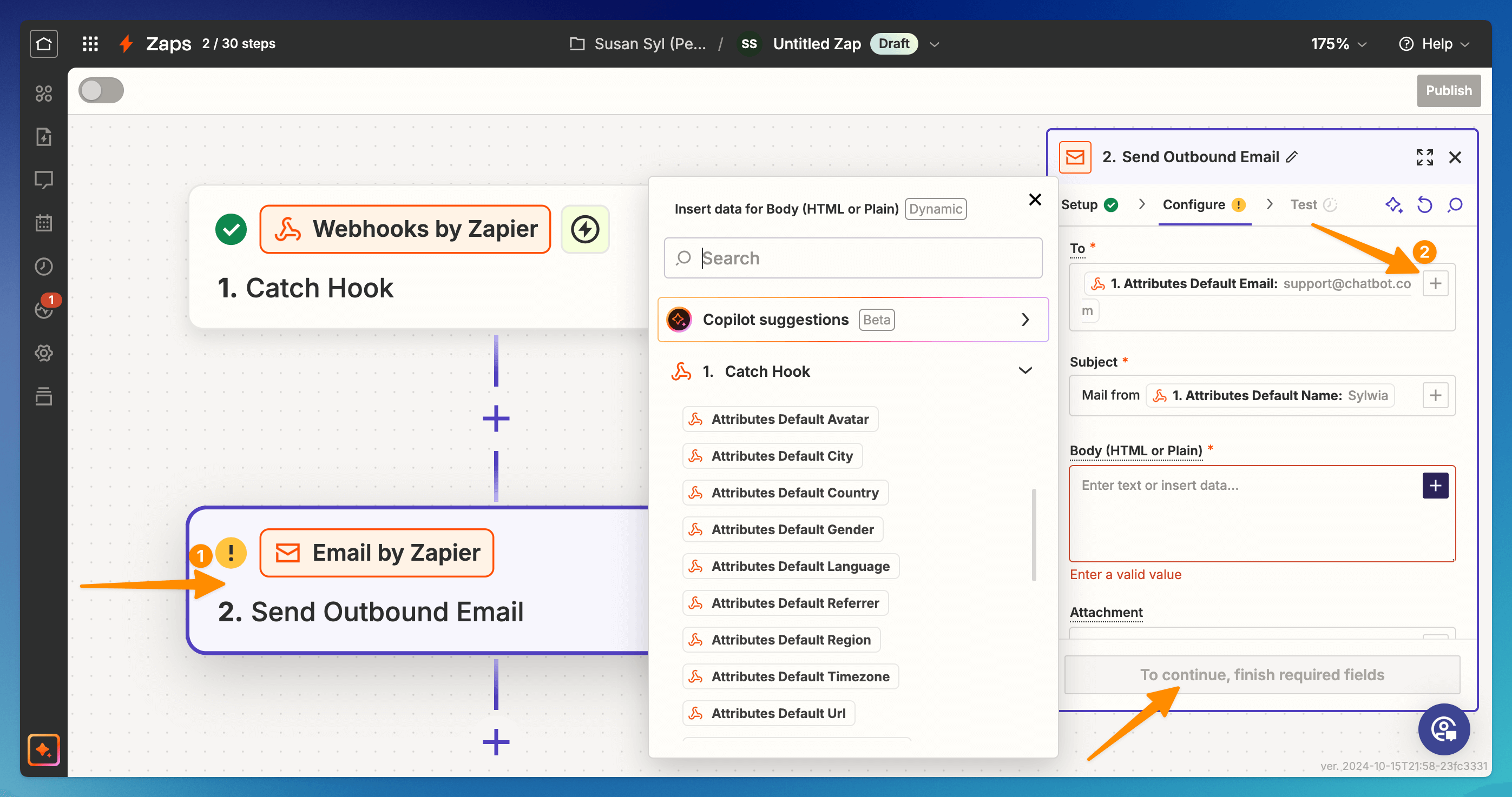 Go to the (1) Action module and (2) use the + sign to configure the action by adding attributes collected during the test chat. You can combine attributes with plain text. When all the required fields are filled, Continue.