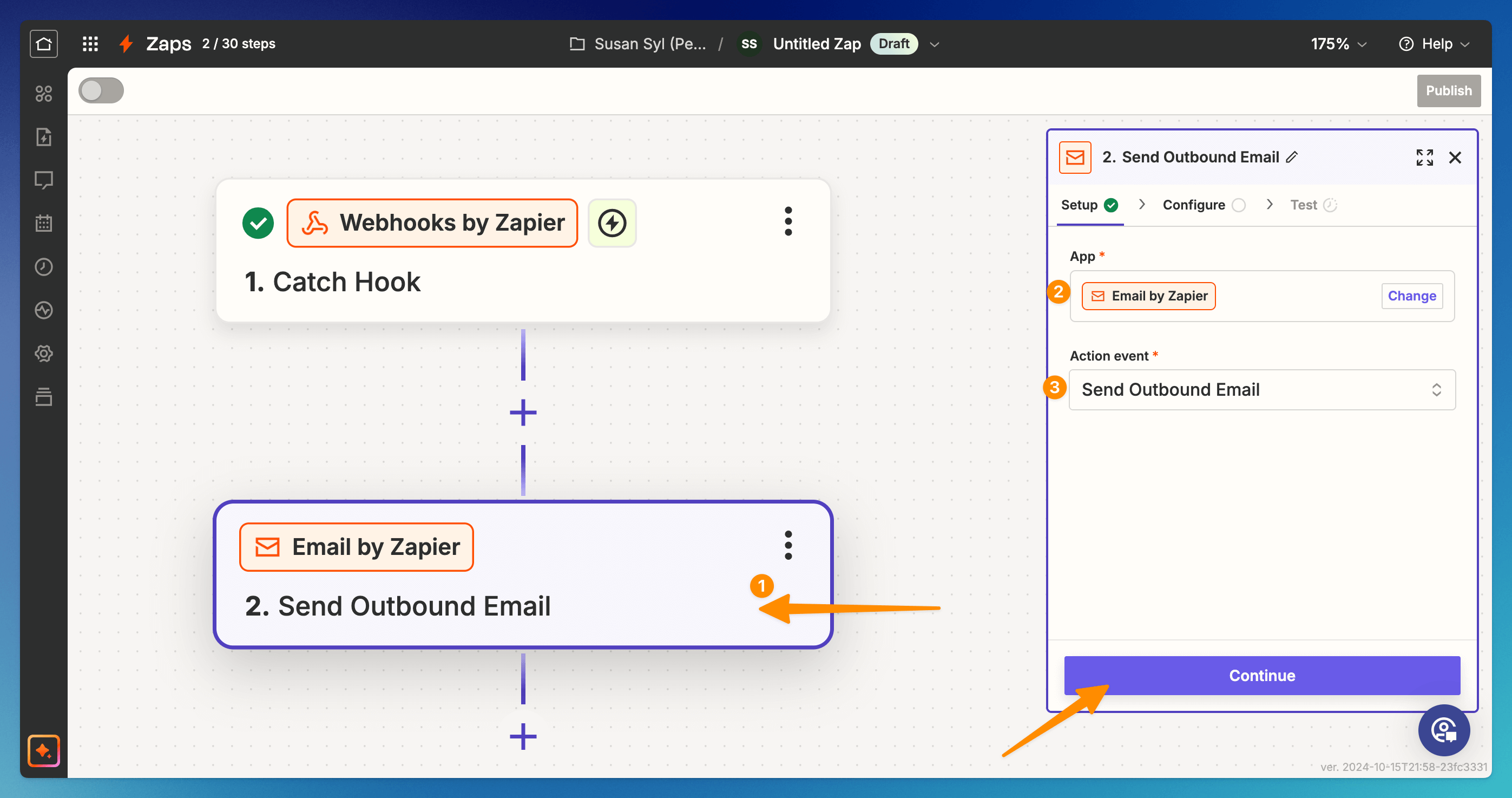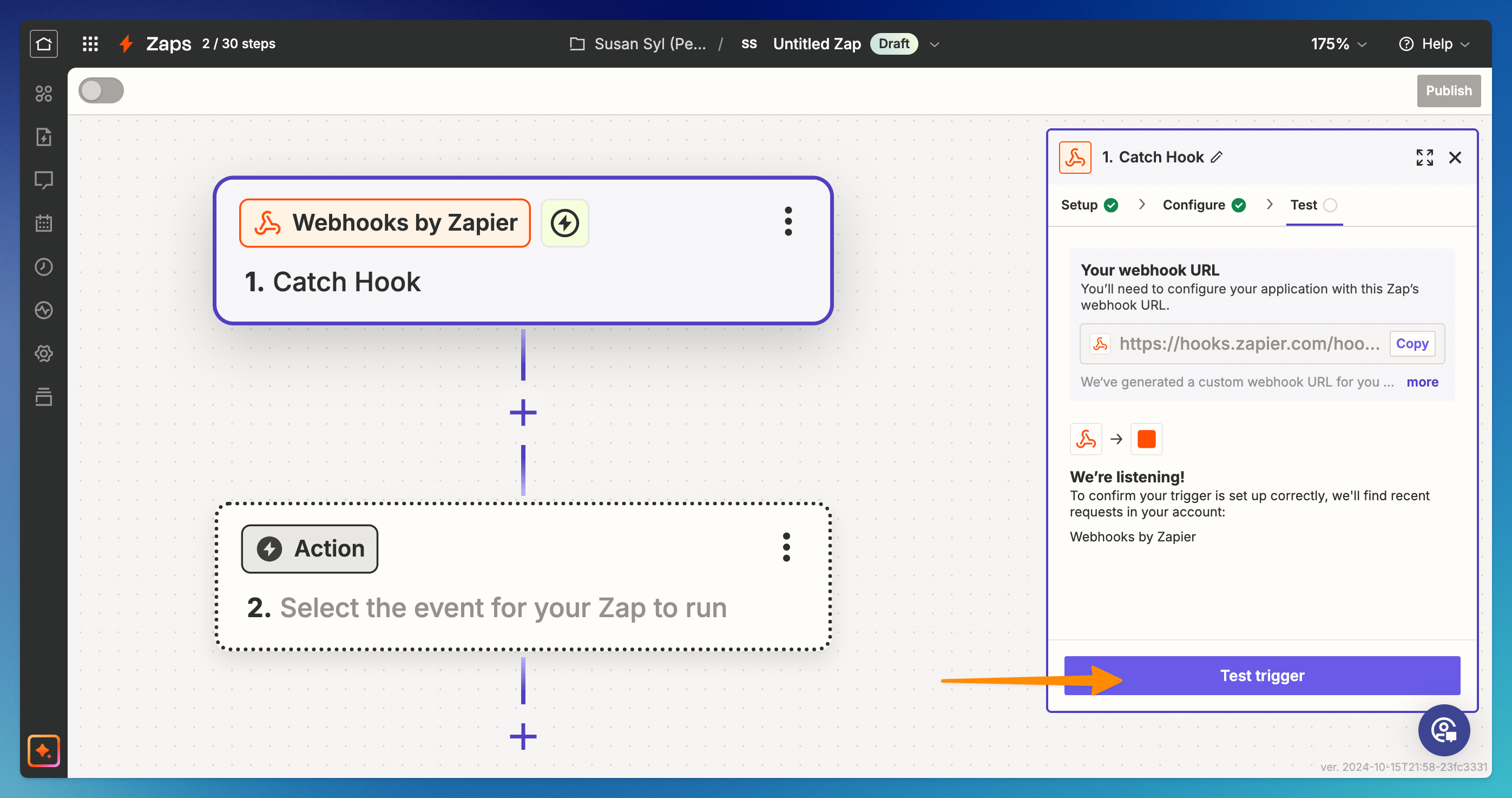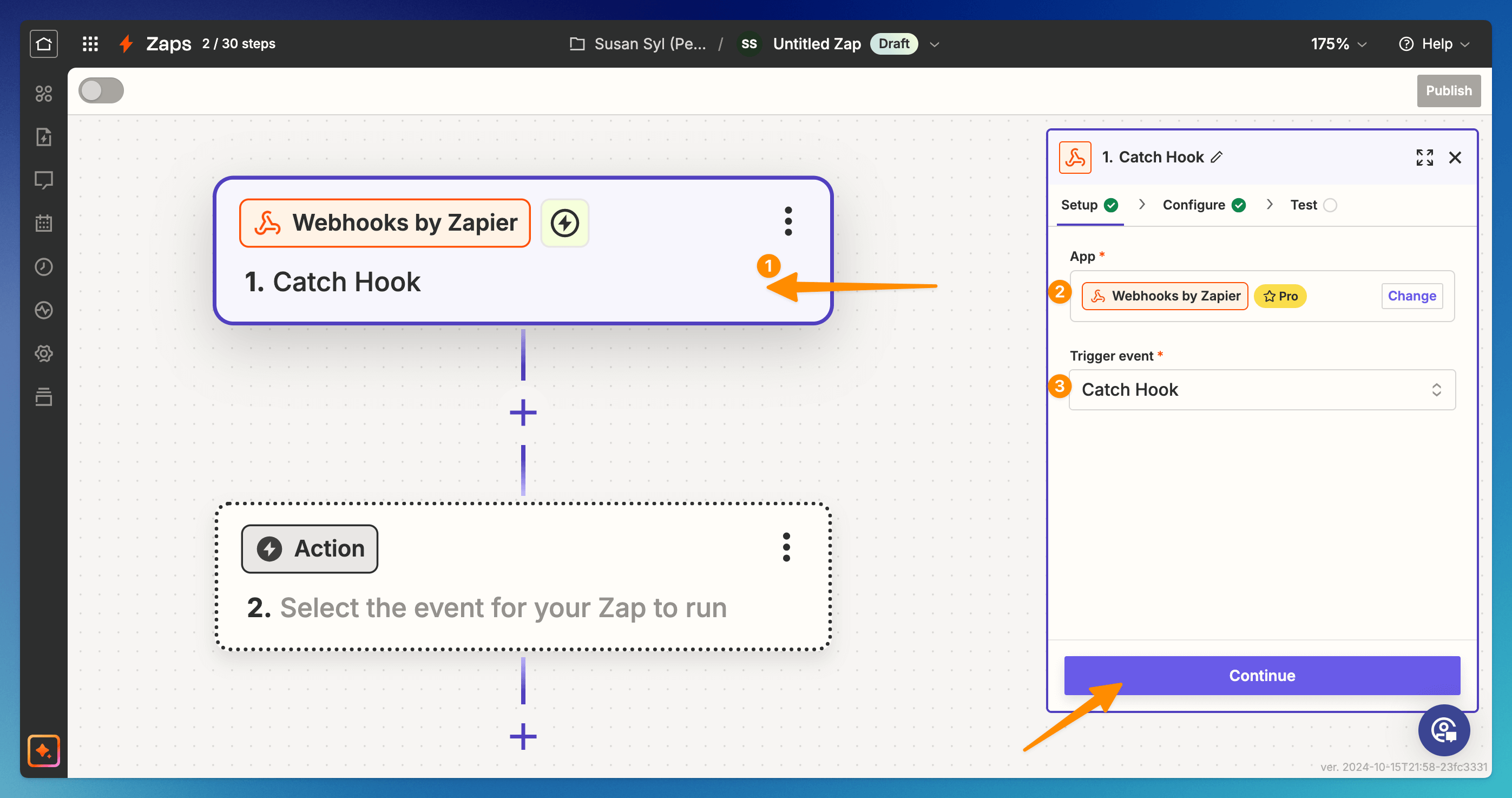 In the Trigger module, choose: (2) Webhooks by Zapier, and in the Trigger event field, choose (3) Catch hook option. Continue.