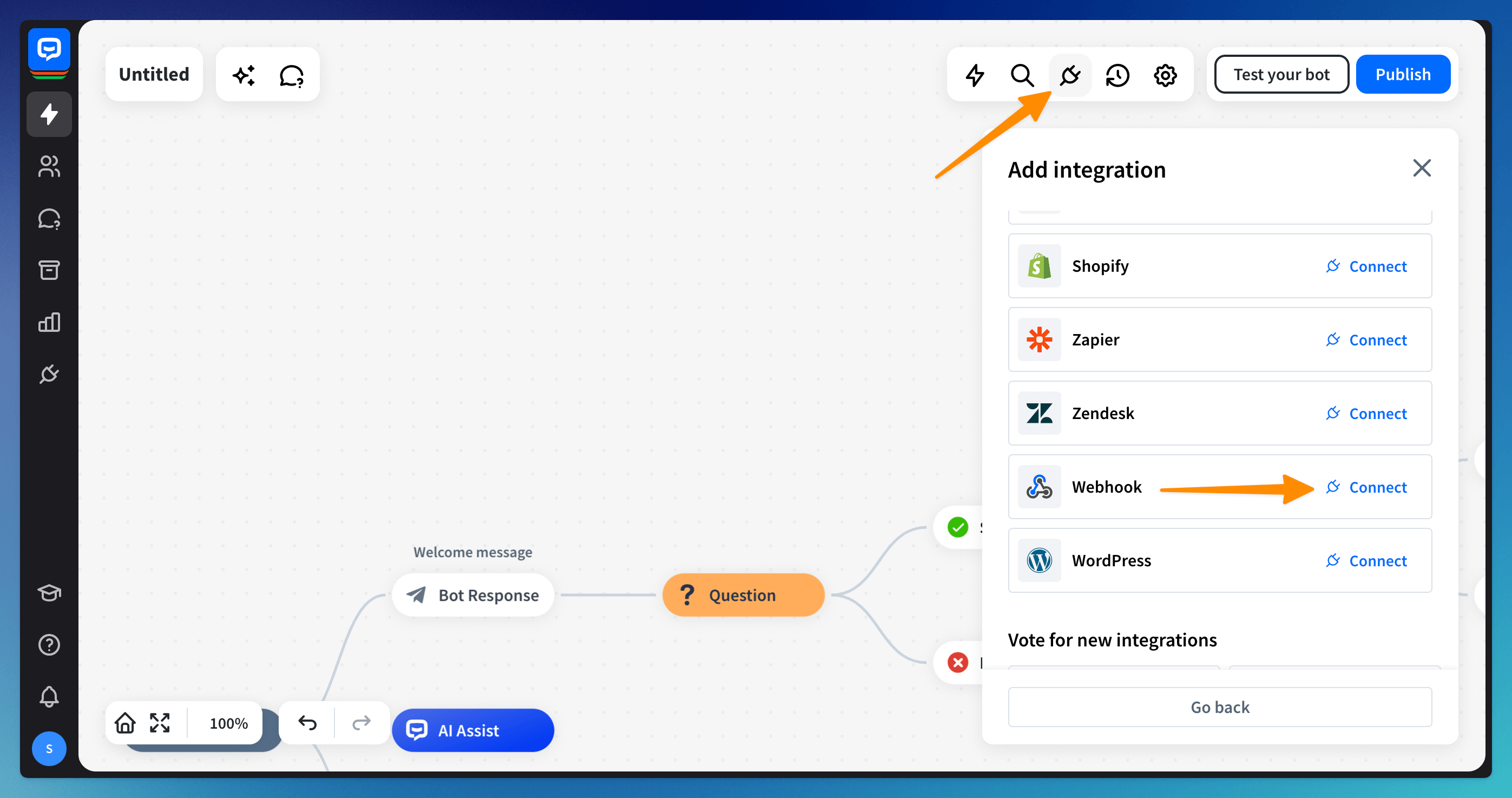 Go to the bot and open the Integrations menu. Choose Webhooks from the list and click the Connect button.