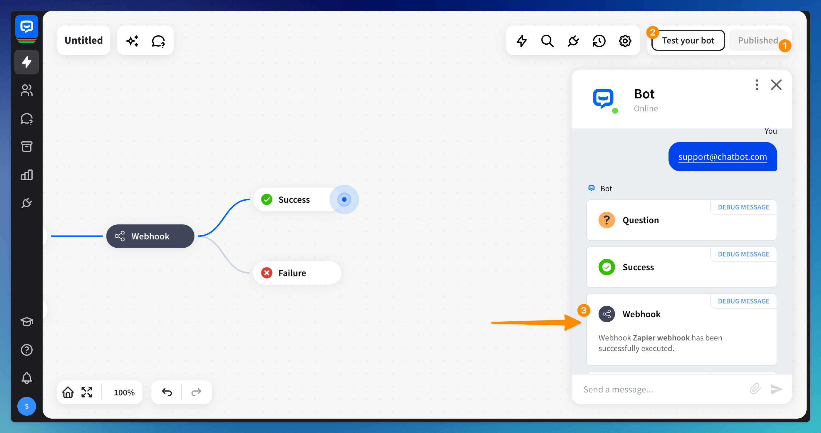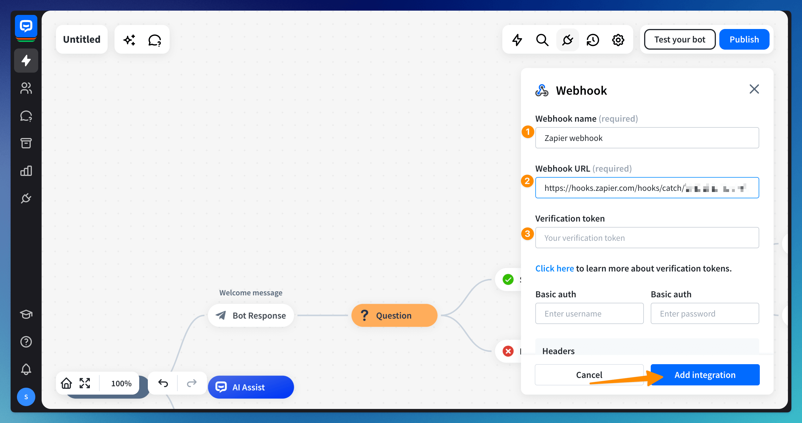 You can create your integration when your app is unavailable in the Zapier Marketplace. With Webhooks by Zapier, you can integrate the bot with even more apps. The integration doesn’t require coding skills.
