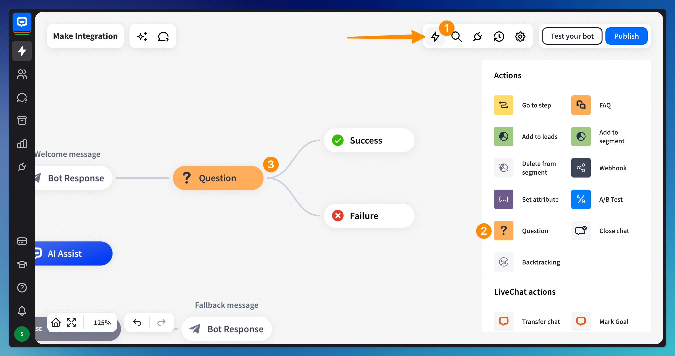 Go to the bot and test the integration in the Testing tool (1). Remember to trigger the Webhook action during the test chat (2).