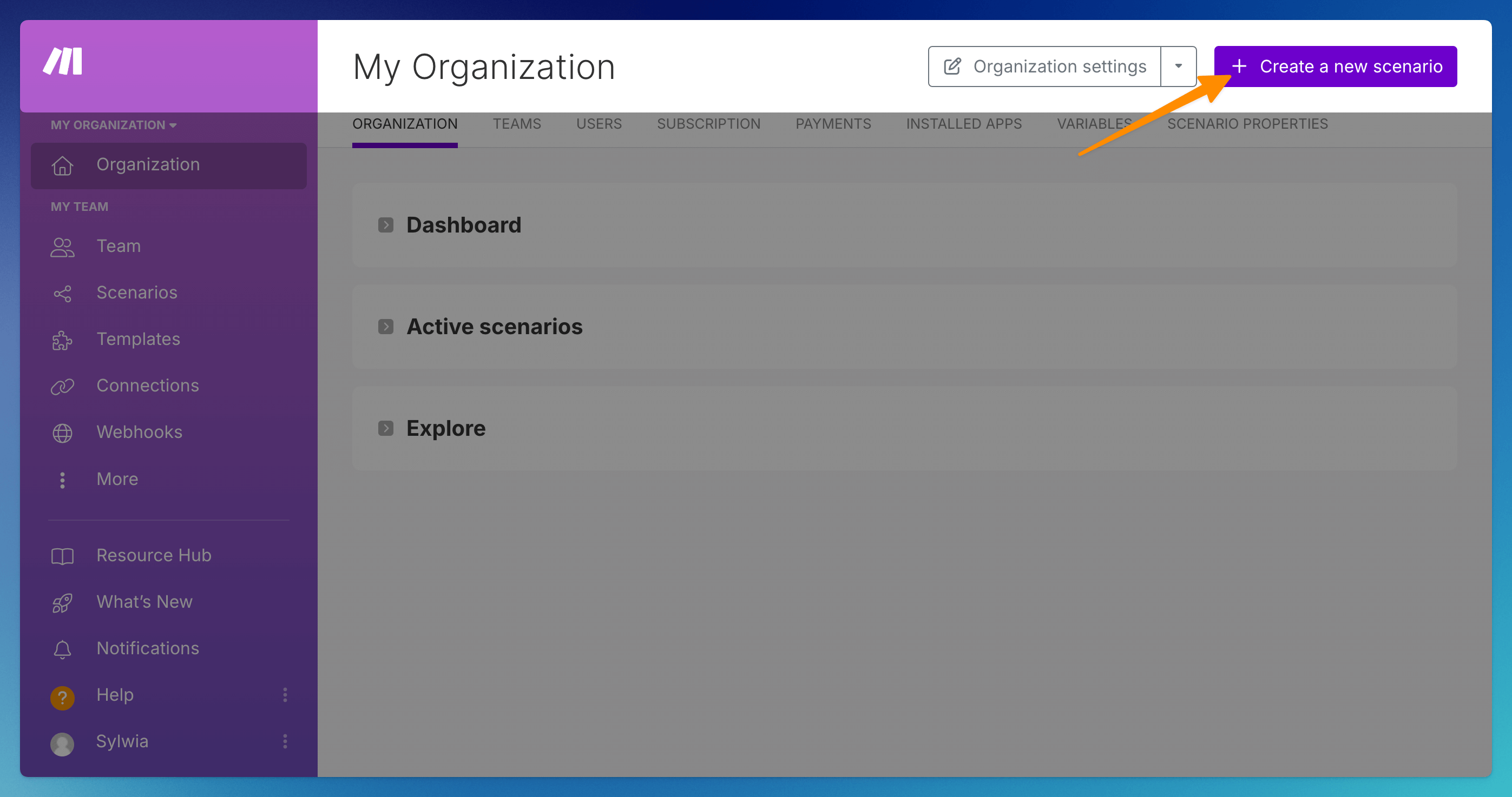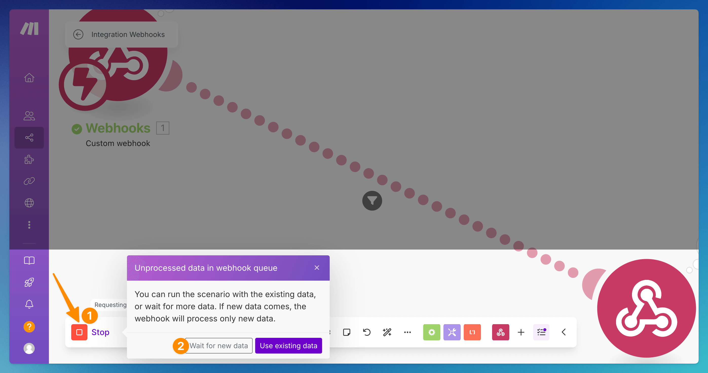 You can edit, disable, or delete the webhook in the Make app. To do so, select Scenarios from the left-side menu (1), select the correct webhook from the list (2), and make the necessary changes.