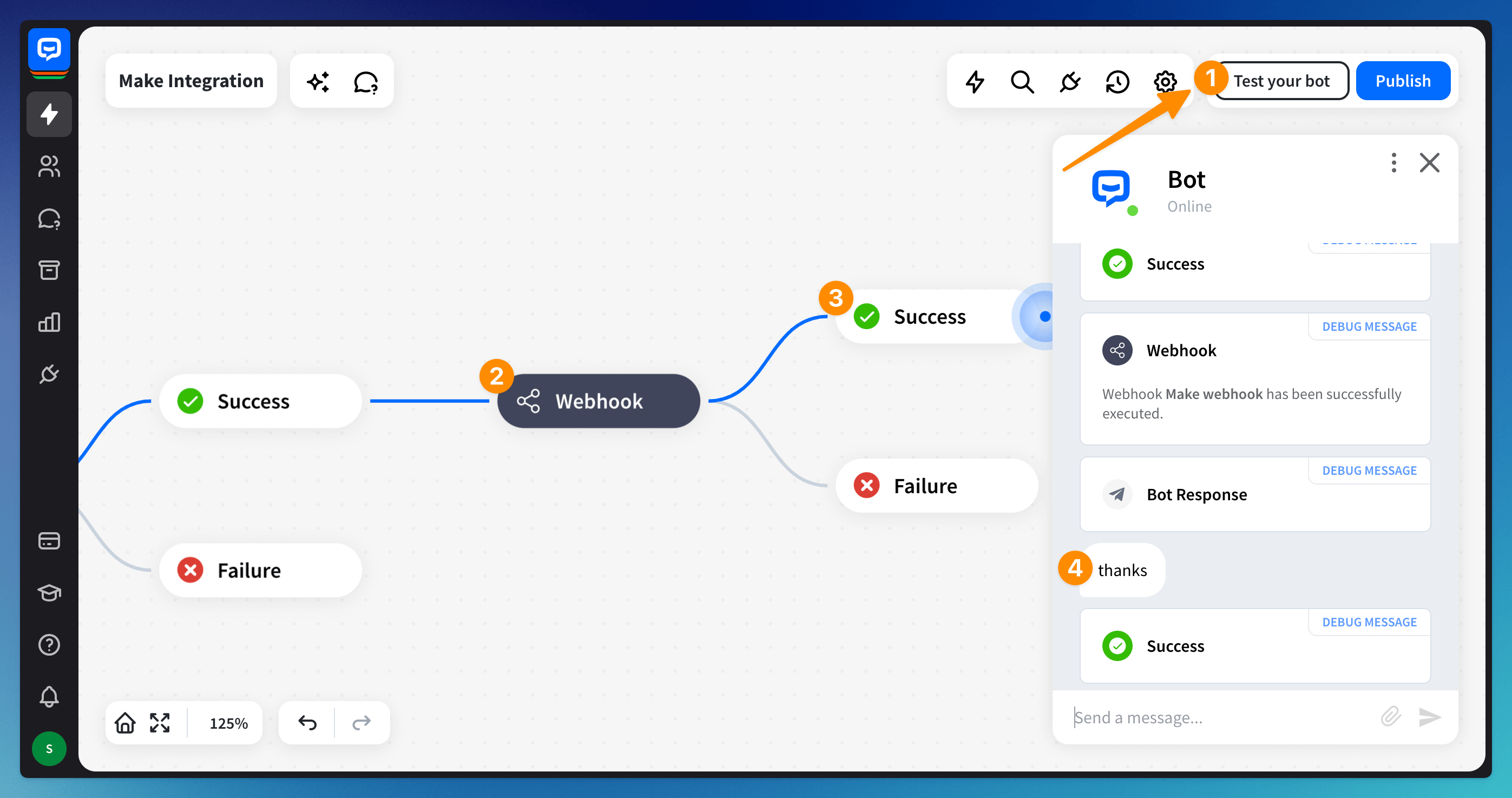 Go back to the bot. Test the prepared bot flow - use the Test your bot button (1). Use the Debug mode (2) to see when the webhook was triggered (3). You can also see the message returned (4) to the chat from Make.