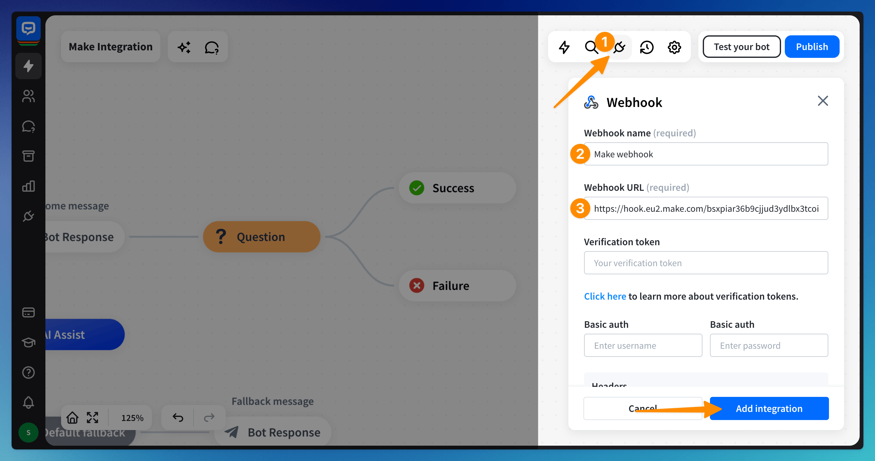 Go back to the bot view. Choose the Integrations icon (1). Choose Webhook from the list. Name the webhook (2) and paste the copied URL (3). Click the Add integration button.