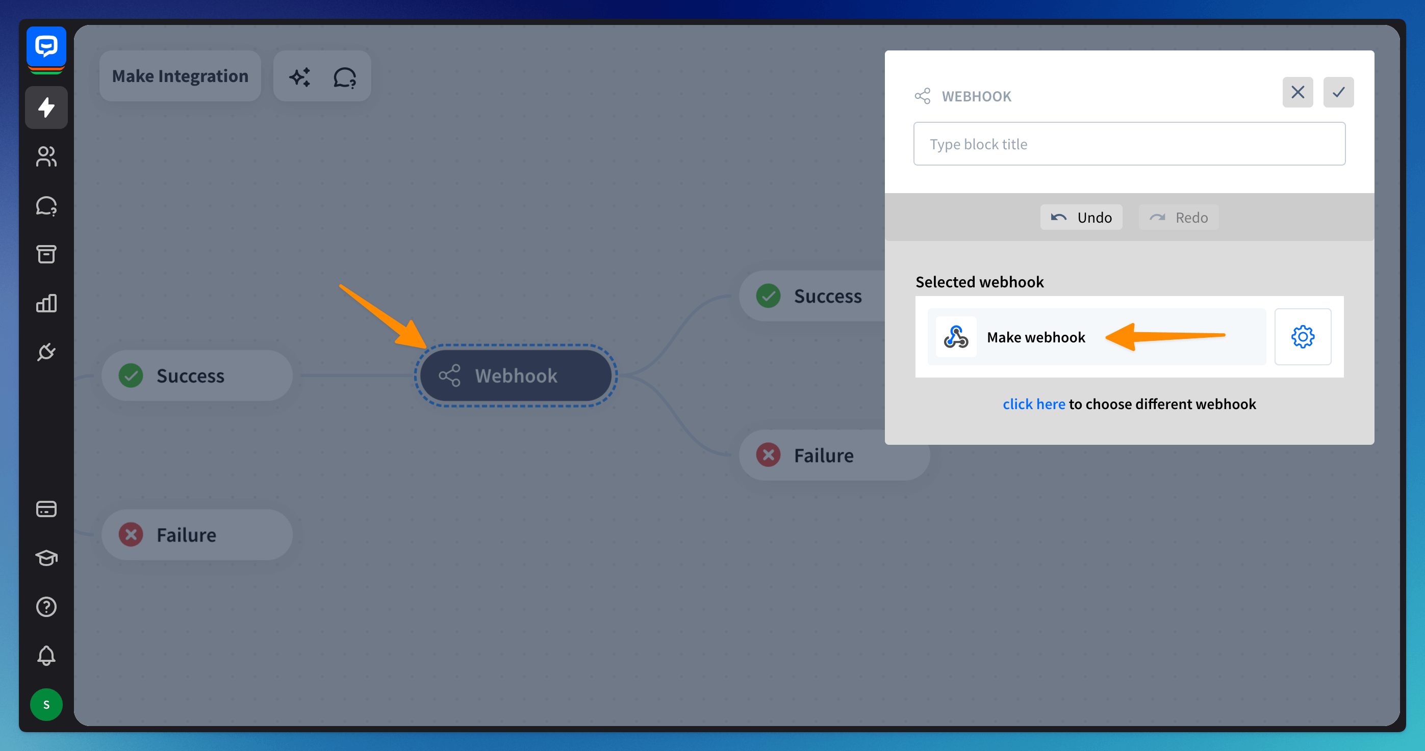 Add the webhook block after the Question’s Success block and click on it. Add the webhook to the block. Go back to Make.