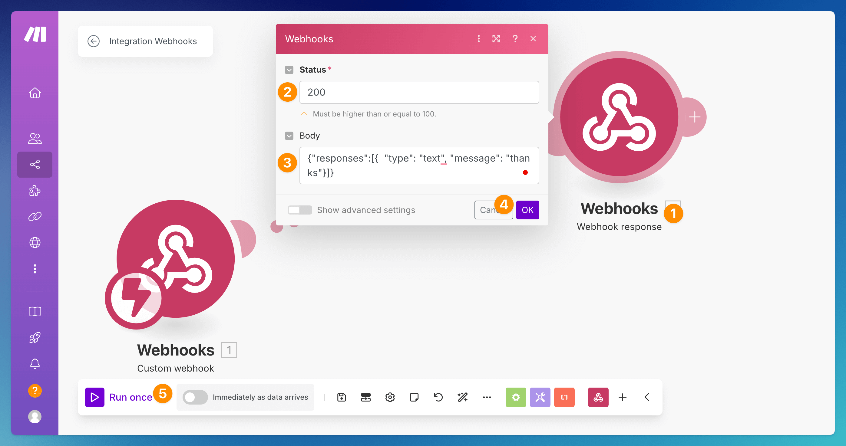 Add another module in Make. In the next step, choose Webhooks and the Webhook response (1). In the new module, check for Status 200 (2) and provide responses you’d like to return to the chat (3). Save with the OK button (4). Click the Run once button (4).